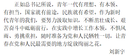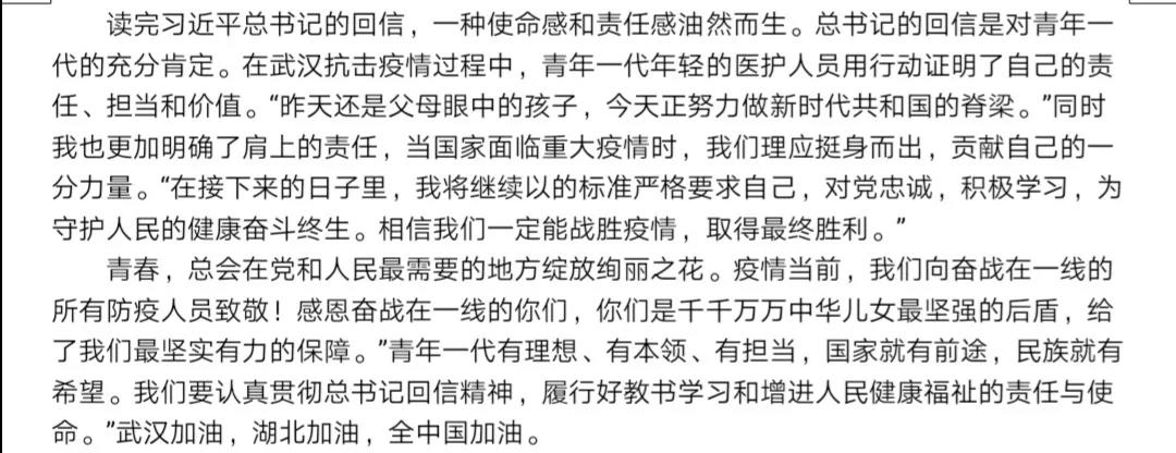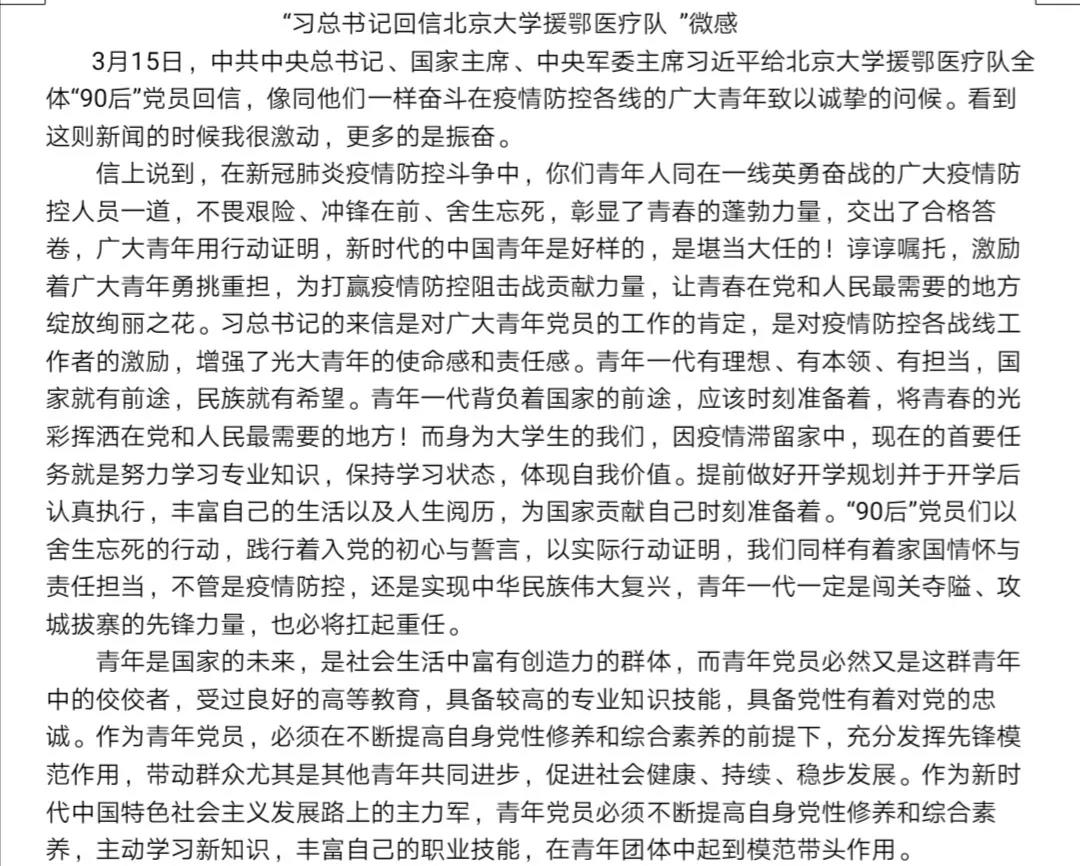 跳蛋 学生党员围绕“习近平总书记回信”心得体会 作者:李孟帆 来源: 跳蛋 发布时间:2020-07-07 阅读次数: 中共中央总书记、国家主席、中央军委主席习近平3月15日给北大学生援鄂医疗队全体“90后”党员回信,向他们和奋斗在疫情防控各条战线上的广大青年致以诚挚的问候。 跳蛋 17级党员、预备党员,19级各班团支部积极响应号召,感受颇深,执笔写下内心的真实体会。 (审核人:相萌萌)