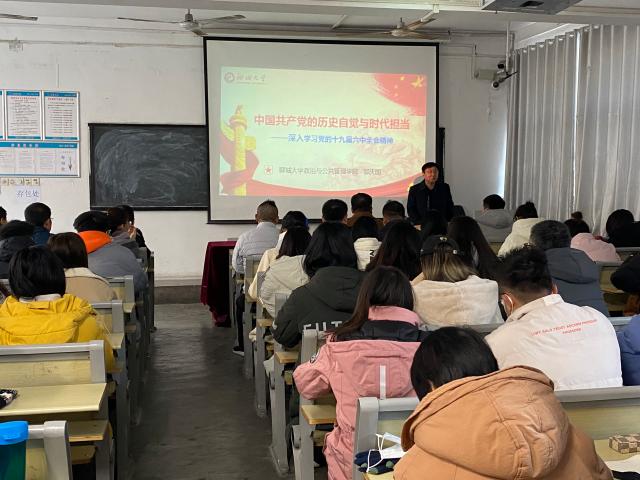 12月27日, 跳蛋 于西校区7#301举办学习贯彻党的十九届六中全会精神宣讲报告会,此次报告会由 跳蛋 党史学习宣讲团成员邹庆国教授以“中国共产党的历史自觉和时代担当”为主题做专题报告, 跳蛋 全体教工、学生党员、部分入党积极分子等参加报告会,报告会由学院组织员许中美主持。