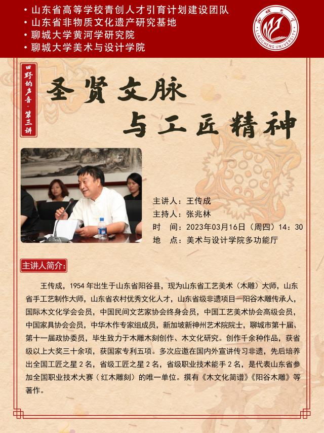 3月16日, 跳蛋 邀请了山东省工艺美术(木雕)大师、山东省级非遗项目—阳谷木雕传承人王传成老师为同学们作了题为《圣贤文脉与工匠精神》的讲座。