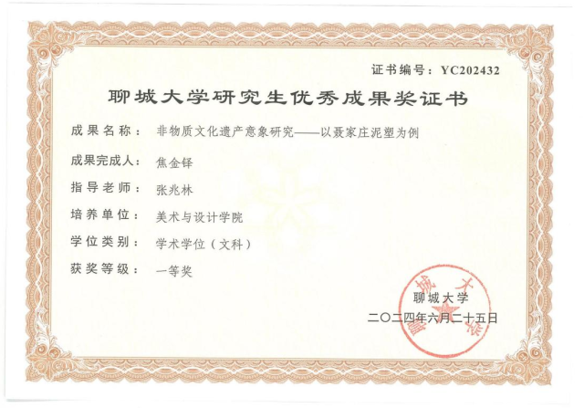 2024年11月论文《鲁东地区“拴娃娃”民俗研究——以高密聂家庄“泥娃娃”为例》荣获第六届“光祈杯”全国高校艺术学科学生论文比赛研究生组三等奖;