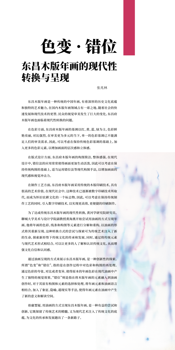 黄海燕将东昌木版年画的色彩、线条和构图等元素进行分解和重构,以油画的方式进行表现,将传统民间美术元素与现代艺术形式相结合,为传统文化注入新的生命,也体现了作者对传统文化的理解和思考。