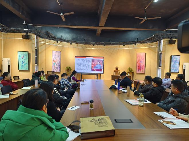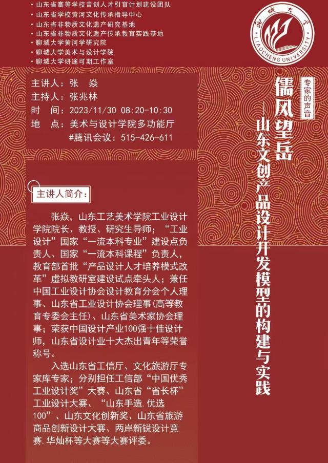 11月30日上午, 跳蛋 邀请山东工艺美术学院工业设计学院院长、教授、研究生导师张焱在 跳蛋 一楼多功能厅作线上《儒风望岳——山东文创产品设计开发模型的构建与实践》学术报告。报告由张兆林院长主持,学院师生、非遗传承人等40余人参加了报告会。