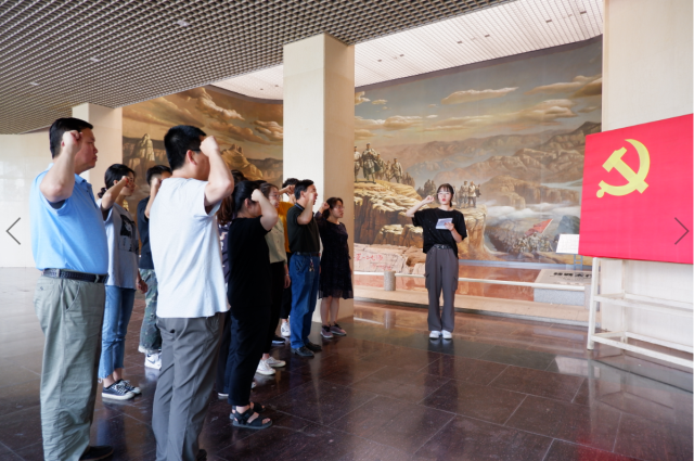 在陈列馆小报告厅,支部同志们聆听了高级讲师李美菊以“不忘初心、牢记使命”之审时就势,夺取胜利为主题的党课。李梅菊围绕“抗日民族统一战线”、“敌进我进”及游击战术、“发展经济,保障供给”三个环节再次回顾了抗战时期革命先辈不怕困难、勇于牺牲,为民担当、敢于奉献的革命精神。最后,全体人员在陈列馆内大厅前,面对党旗集体重温入党誓词。