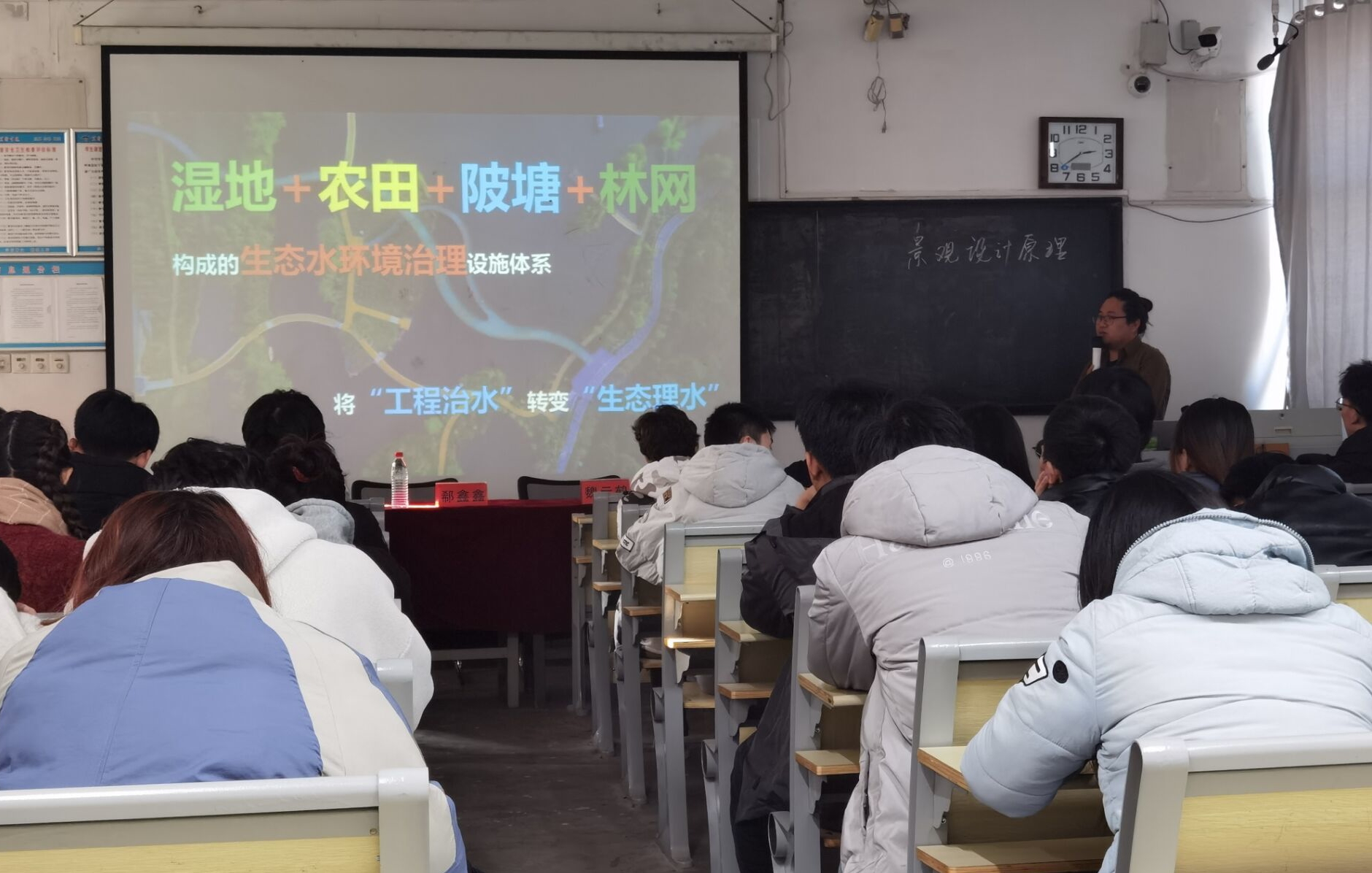 此次授课共分为深入了解景观设计原理、了解就业方向、互动交流三个部分进行。在授课中,同学们了解到景观设计原理的核心是景观环境空间形态,景观环境生态资源,休息环境与行为感受。学习将广义的景观学,狭义的景观设计,景观设计和造园,景观设计和环境设计进行比较,总结出景观设计是以建筑组成的特定环境为背景,是有一个标识性很强的主体艺术品作为该环境的中心,而形成的具有一定审美意趣可供欣赏的人工风景。而美化环境则是景观设计的重要目的。课程过程中魏云鹤设计师从城市到农村进行一一讲解,让同学们对于设计的各种内容进行独到的理解。而课程中的每一个知识点更是写在本上记在了心中,以便将来学习中的使用及翻阅。