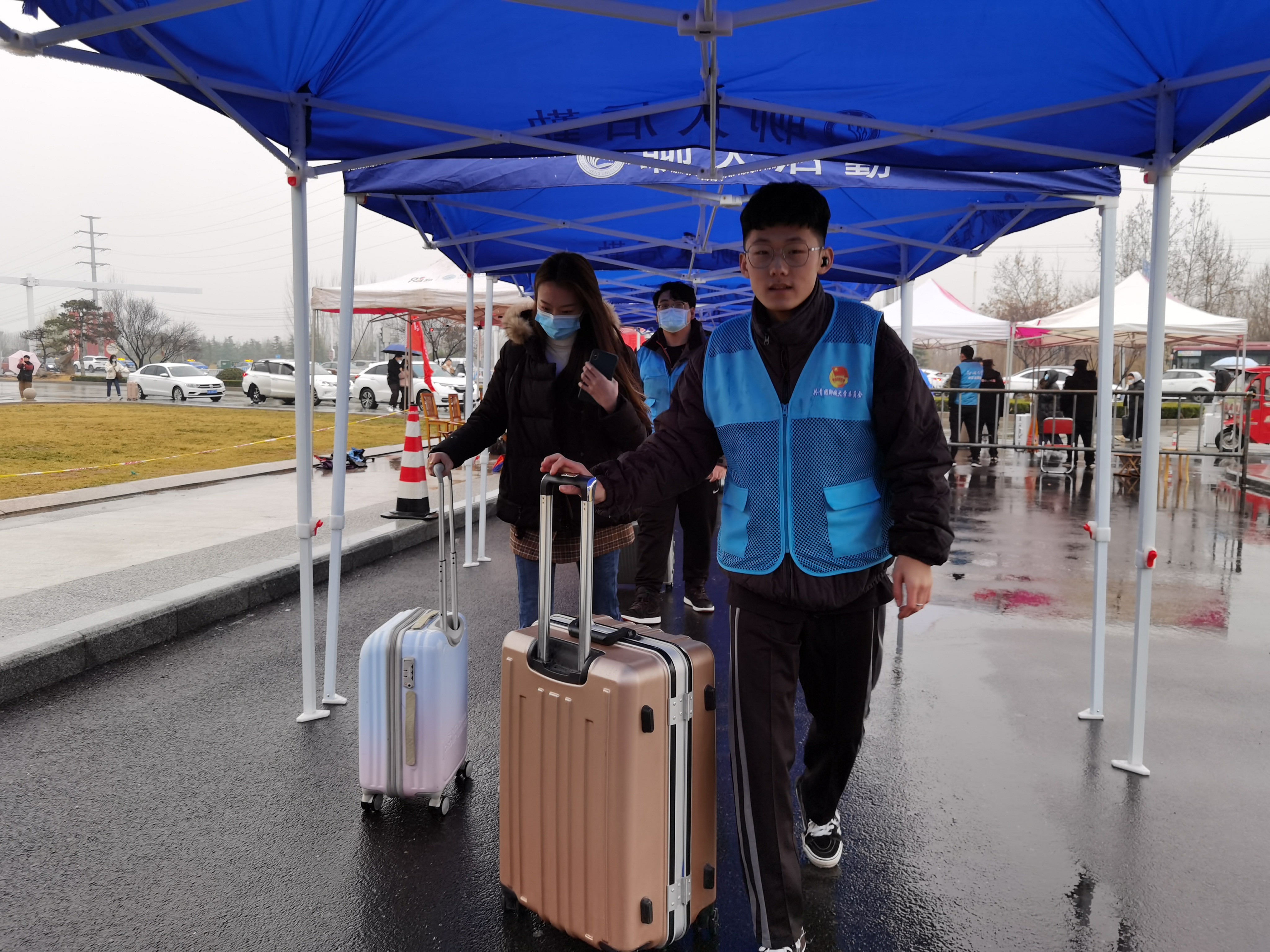 晨光破晓,天色微亮,一顶顶小帐篷整齐排列着。志愿者、老师们已早早到位,他们身穿鲜艳的红马甲,等待着同学们的到来。学生佩戴口罩,进行行李箱消毒,测量体温,出示健康二维码、易班返校码,进行验证,每一个步骤都必不可少。由团委辅导员孔德滕老师带领志愿者们工作, 跳蛋 易班服务中心的工作人员守在门口处进行一一核对,志愿者和老师们贴心地服务每位同学,引导他们进入校门、帮助他们一遍又一遍地搬运行李。细雨朦胧中,他们的身影显得格外耀眼。直到每一位同学都上了校内公交车,他们才又抓紧时间回到校门口,帮助后来的同学。有了志愿者们的配合,返校工作更加的有序。即使到了晚上,志愿者们也依旧不放松,坚守在岗位上,帮助每一位返校同学进行登记工作。