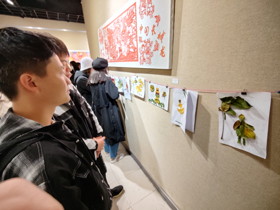 同学们为了准备这次的作品,穿梭在校园中,拾起一片片落叶,敛起一缕缕秋意。大家积极发挥自己的才能,大胆展开想象,以国防为主题,利用在校园里收集到的落叶完成了自己的创作,用自己的匠心妙手把秋天留在了纸上。有同学把树叶拼接成了解放军战士的模样,有同学借助枯枝绘制出了阅兵的场景,还有同学将各种植物根茎做成了我国的“国之重器”们,每件作品都各有千秋,也让展厅里充满了大自然的气息。现场的同学们认真欣赏着展出的作品,与周围的同学讨论作品内容,自由交流创作经验。大家积极发表自己的看法,相互沟通学习,开拓了自己的思路,提高了自己的审美能力。更有不少同学将自己感兴趣的作品拍照记录了下来,以作留念。
