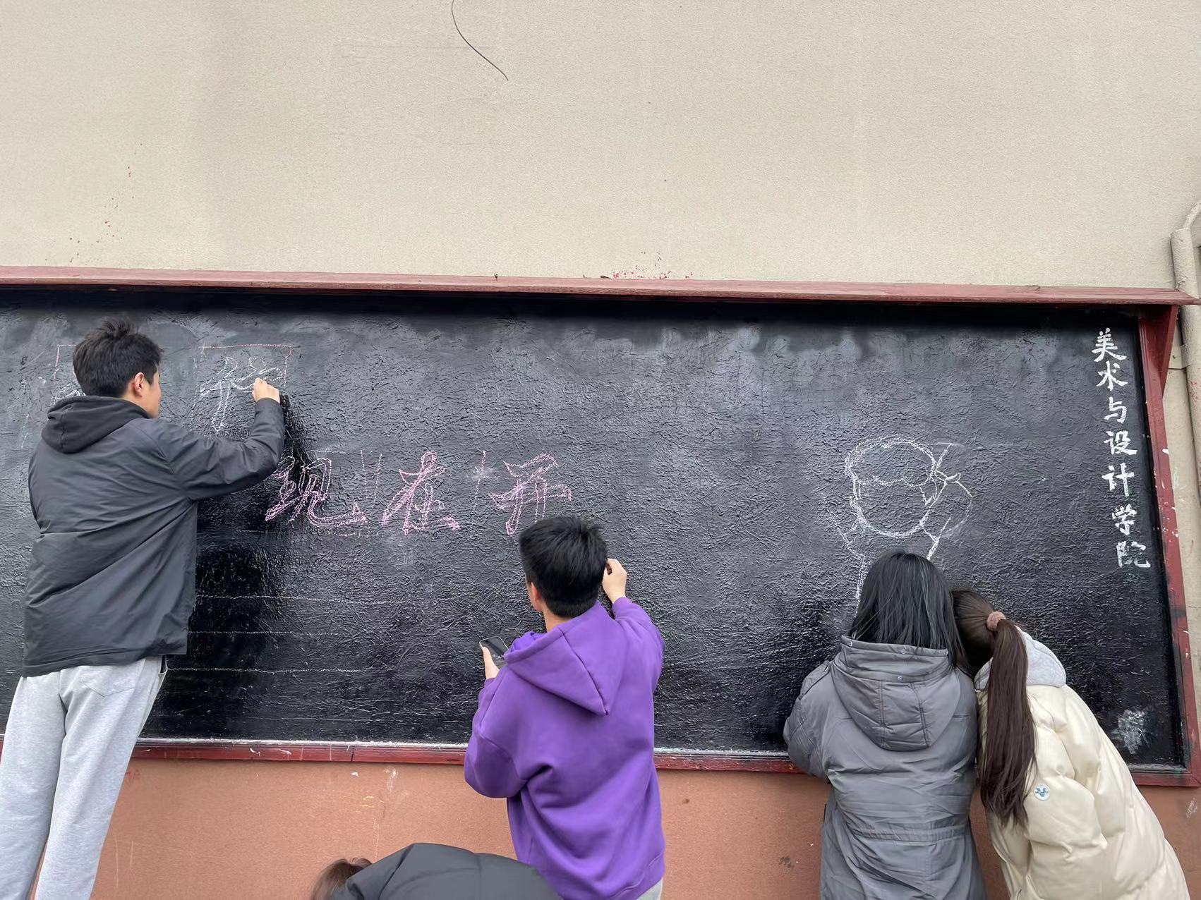 正式开始绘制前,志愿者们提前将所需要的喷漆、颜料、画笔等工具带到绘制地点,认真商讨建党百年相关内容与素材,并按照事先设计好的模板在宣传黑板上起稿,有条不紊的进行着绘制。各位志愿者充分发挥自己的专业特长,分工明确,相互协作,在志愿者们的努力下,板报的绘制顺利完成。潇洒的字体、高级的颜色搭配和简明的排版设计都凝聚着志愿者的汗水和智慧。“消防安全,人人有责”几个大字遒劲有力,绘制的插画更是切合主题,许多路过的行人与同学被吸引,纷纷驻足欣赏。志愿者们热情地与大家分享本次板报的设计初衷和灵感来源,并借此机会宣传了消防知识。绘制结束后,志愿者们整理好工具,清理了现场残留的颜料和其他垃圾,并合影留念。