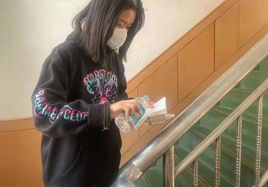 活动前期,志愿者们积极普及疫情消毒知识,围绕专业工作单位的消毒方法、卫生注意事项等方面展开准备工作。志愿者们假期回到家中,对社区的疫情防控工作人员进行疫情防控方面问题的咨询,并在网上、书籍资料上查询消毒液的配兑比例以及注意事项。为避免多人集中,志愿者分成若干个组进行消毒工作。志愿者们认真地把楼道每个角落进行消毒并进行楼道通风,清除卫生死角,针对小区居民经常接触的门禁按钮、电梯按钮、门把手、扶手也进行了擦拭,做到最仔细的消毒工作,创造一个干净整洁的环境。最后,志愿者以社区广播、传单和面对面沟通等方式对居民进行疫后心理疏导活动,舒缓居民在疫情期间紧张的心情,让他们对国家有信心,坚信这场疫战,取得胜利!