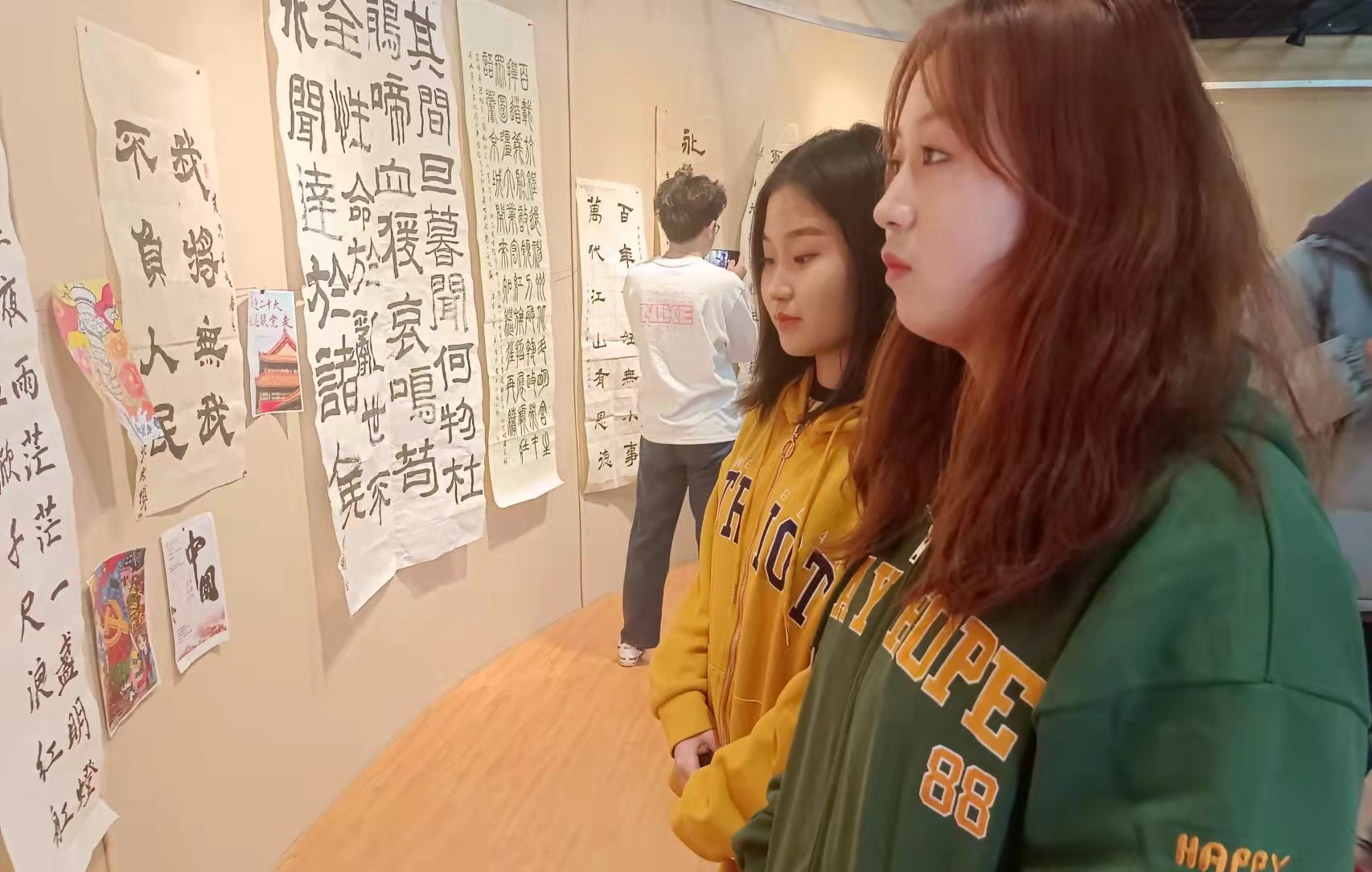 同学们准时到达展厅,组织人员有序调节会场秩序,以保证活动顺利开展。活动中,一幅幅形式多样、主题鲜明的书法、绘画作品,充分展现建党精神、爱国精神。在展厅内,同学们分成小组相互交流,认真分析每幅作品的优缺点以及背后独特的创意,互相交换创作构思和想要表达的深刻内涵,心情尤为高涨,并纷纷拿出手机拍照留念。行云流水的书法与形神兼备的绘画作品,都体现着同学们对国家的热爱与致敬,不同的艺术观念得到了碰撞,迸发出了新的灵感,碰撞出了新的火花。