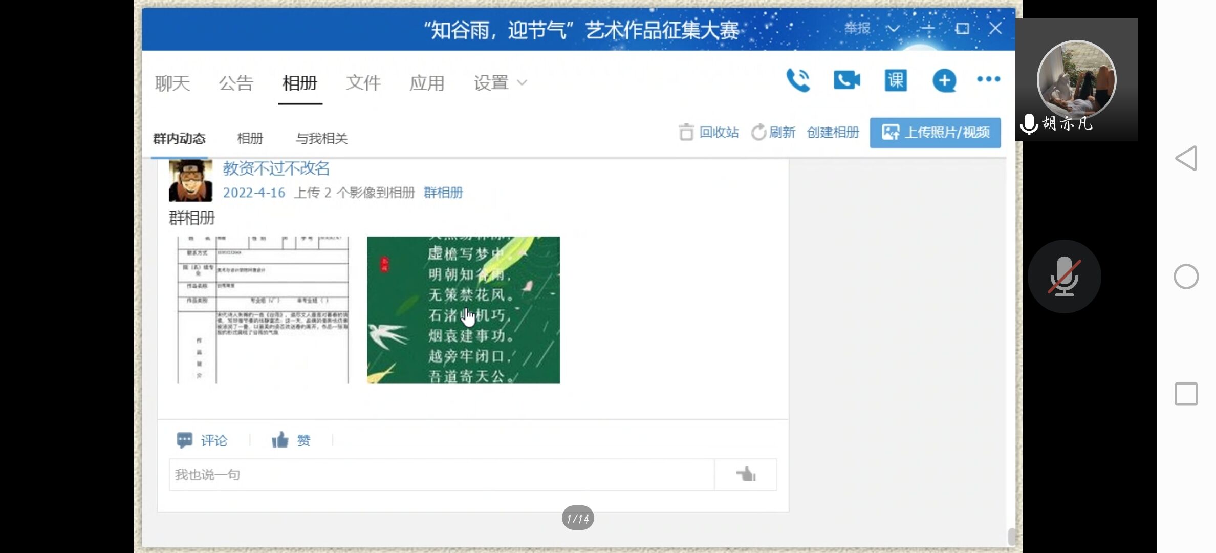 活动开始的前期,活动负责人在到梦空间进行活动发布,同时做好线上宣传工作,鼓励同学们积极参与。每位同学在规定时间内进行作品创作,并进行上传,活动负责人于4月17日下午以直播会议的形式对活动作品进行审评,在会议中,由部门负责人员进行PPT的讲解,给活动的参与人员播放关于谷雨和香椿的视频,以抽签的形式让活动的参与人员来介绍并讲解自己的创作作品,主要通过创作想法、作品材料与作品意义来进一步加强对谷雨节气的认识。随后同学们开启话筒,进入到相互讨论的环节,期间,每位同学都认真聆听,通过其他同学的讲解,相互学习,相互借鉴,更好的熟知了谷雨节日的由来与典故。活动后期,同学们离开会议后活动负责人对作品进行总结整理并评分。