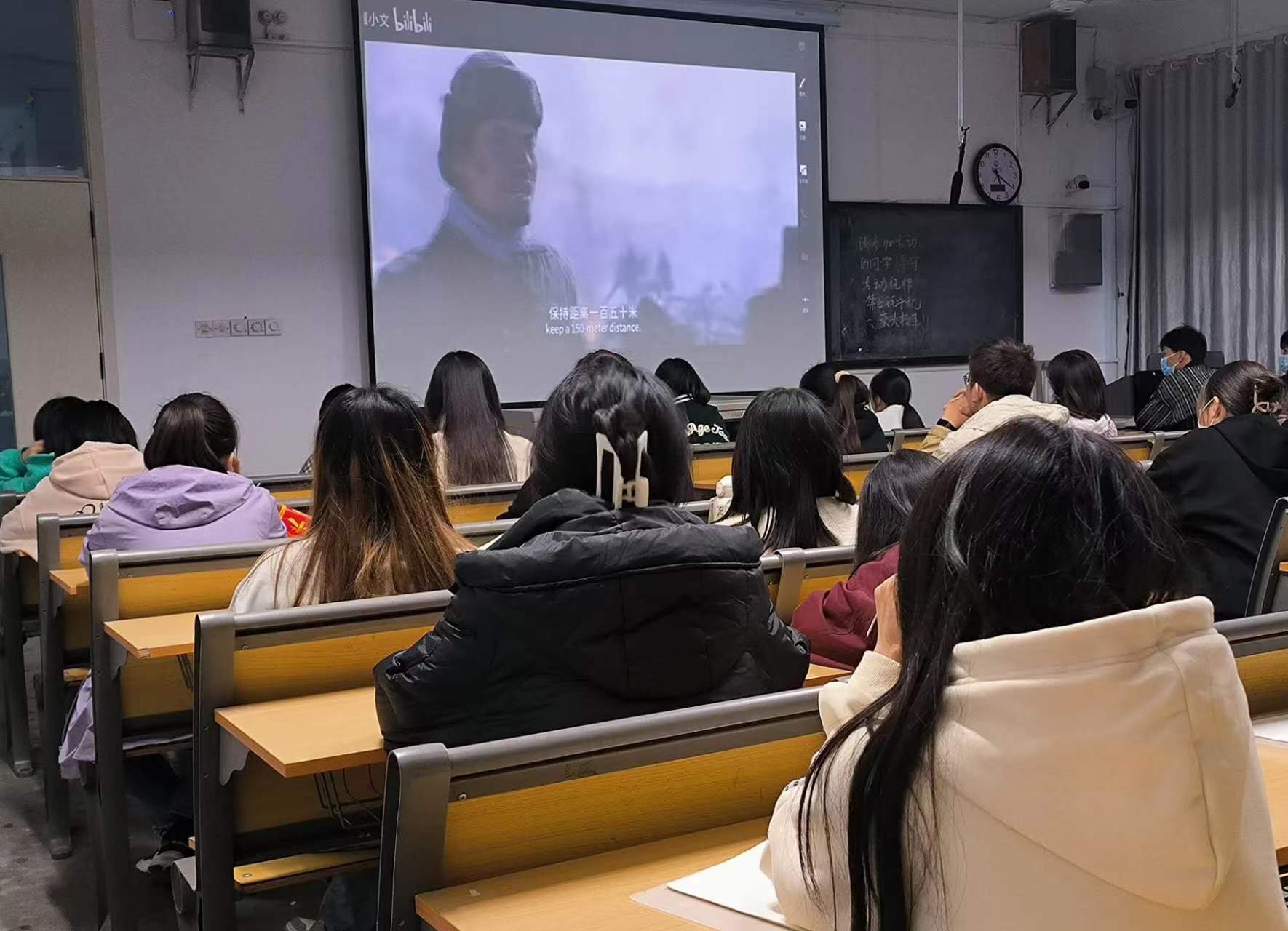 活动负责人组织同学一同响应国家防疫工作号召,督促同学们戴好口罩并且间隔就坐,做好相应的疫情防范措施。观影期间,同学们聚精会神,静心观看,以表达自己对英雄们的尊敬。当影片放映至那些志愿军不惧生死,英勇向前的高潮片段时,同学们眼泛泪光,对“最可爱的人”们不畏牺牲的精神所打动,现场氛围也变得极其严肃。影片结束之后,全场同学仍沉浸其中,思绪万千。同学们还通过本次观影内容总结出了自己的感受,写了一篇观后感,在其中抒发自己对英雄烈士们的敬畏之情,表达自己对伟大抗美援朝精神的理解以及对英勇志愿军们的祭奠。
