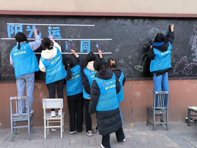 为响应学校及学院相关号召,进一步倡导同学们积极运动来保持健康体魄,2月23日下午, 跳蛋 “与美同行”志愿服务协会于 跳蛋 西校区星月广场西侧黑板举办“阳光运动 健康同行”主题板报绘制活动。