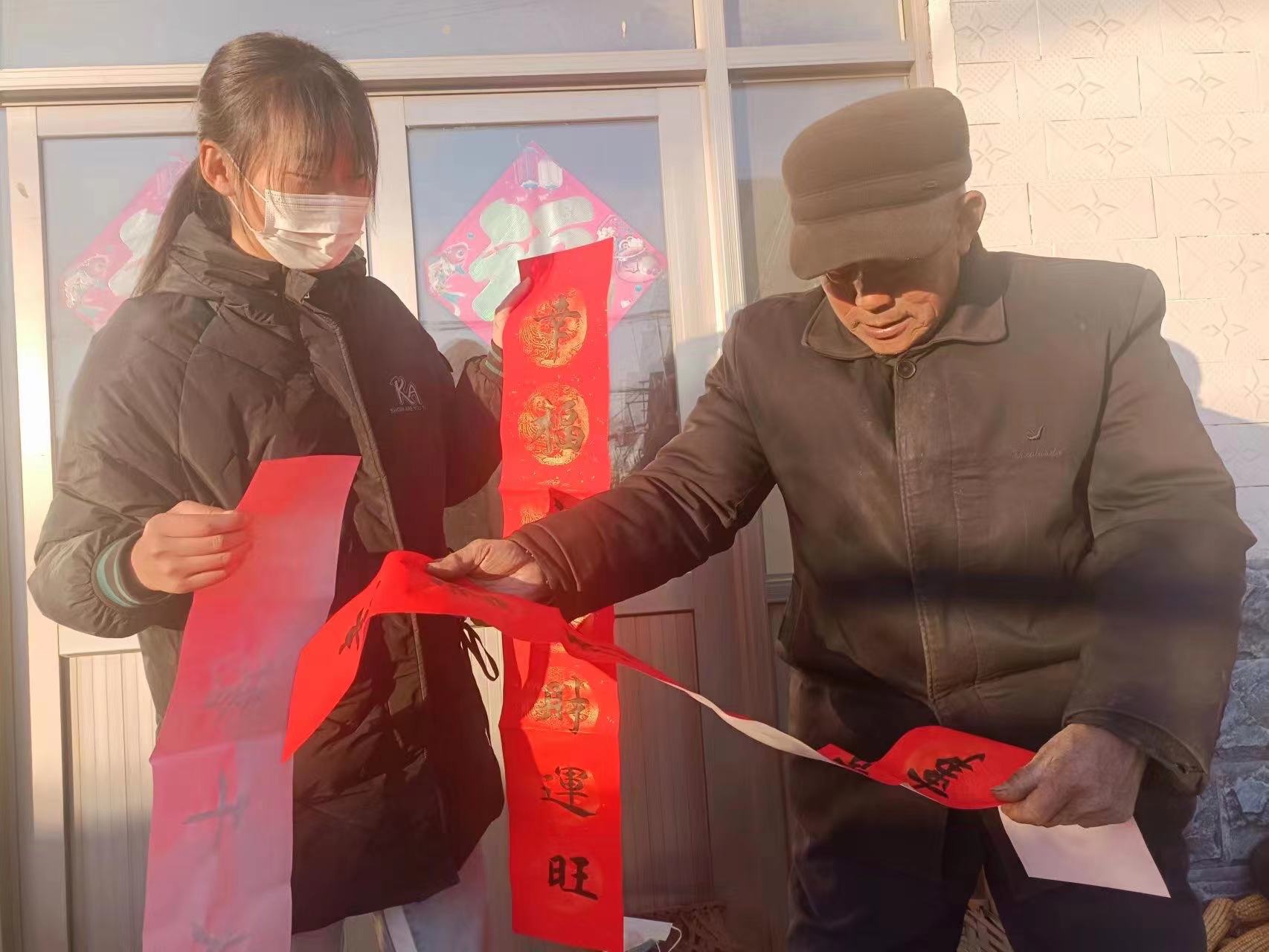 活动开始前期,志愿者们将书写美好祝愿的春联送到老年人家中,为他们送去了“春”的祝福并与他们进行了亲切的交流与沟通,了解他们近期的生活状况、身体情况等,给他们增添了一份暖融融的节日喜庆氛围。活动中,志愿者们走村入户把一张张红彤彤的对联和年画送到老人家中,接过对联和年画的老人脸上洋溢着幸福的微笑,纷纷为这份特殊的新年“伴手礼”点赞。活动渐渐步入尾声,志愿者们与老人一边聊天一边帮忙打扫卫生,为春节的到来做好准备,同时也感受着春节即将到来的快乐。