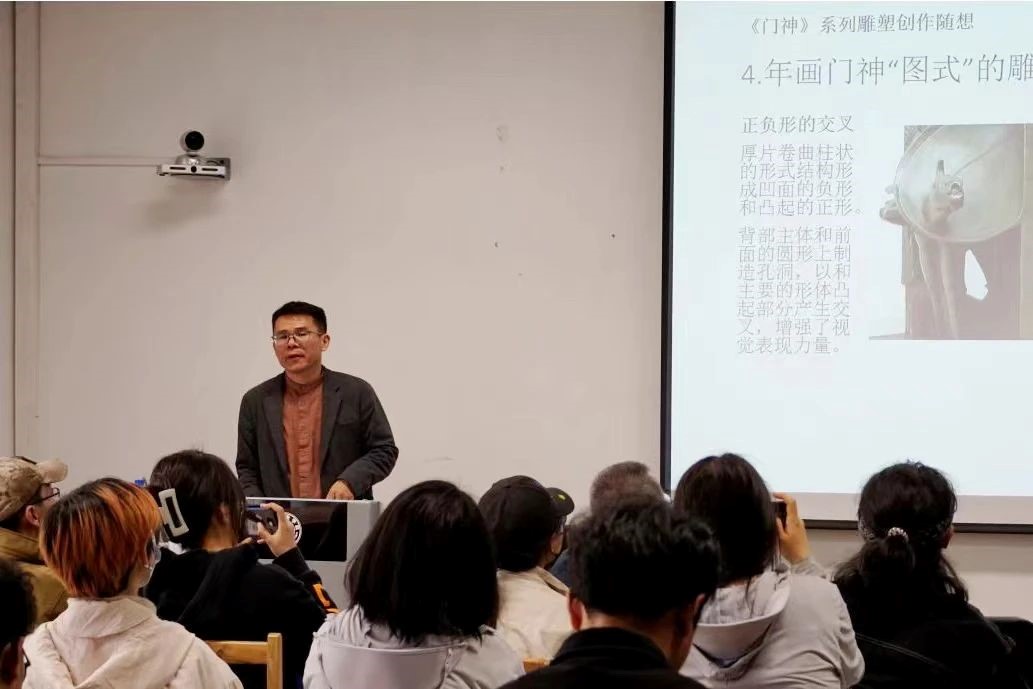 由山东艺术学院主办,山东艺术学院美术学院承办的“山东省高等院校材料艺术教学研讨会”于2023年4月25—26日在山东艺术学院长清校区举行,同时举行相关展览与演讲活动。 跳蛋 副教授、黄河学研究院研究员张西同参加了研讨会并应邀做了《“门神”雕塑创作随想》的专题讲座。