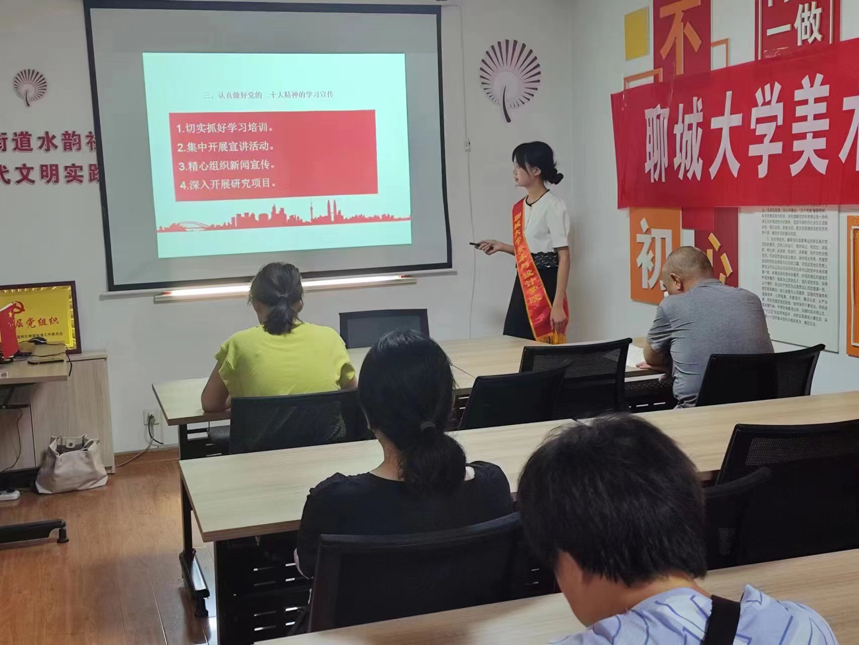 本次活动主要面对社区少年儿童,旨在给未成年人心中种下爱党爱国的种子。志愿者们首先针对党章的内容对社区人员进行主题演讲,通过ppt的形式生动形象地呈现了党章的伟大内涵,向社区人员更准确全面的讲述了党章内容。在党章讲解的同时,同学们在穿插着部分与未成年息息相关的法律知识的科普,做到道德与法律的双传播。宣讲过程中,志愿者们结合聊城当地红色文化开展党史教育实践,向社区少年儿童讲述以范筑先先生为代表的聊城革命先烈 ,呼吁大家向红色榜样学习,继承先烈们的优良精神,为社区带来了一场生动的思政课。