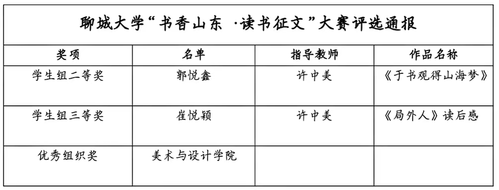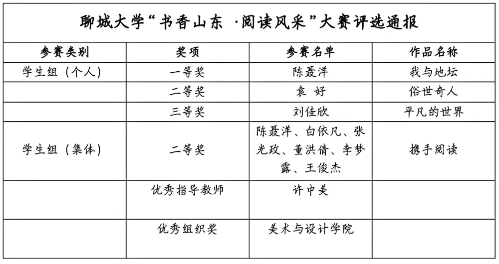 根据《中共山东省委宣传部、山东省教育厅关于印发山东省高校师生“阅读新时代·书香润校园”阅读活动方案的 跳蛋公告 》《 跳蛋 学生“书香山东·阅读风采”大赛实施方案》《 跳蛋 “书香山东·读书征文”大赛实施方案》要求,学院高度重视,精心准备,经学院初选、学校专家评审小组评审, 跳蛋 获得学生组一等奖1项,二等奖2项,三等奖2项,集体奖1项,并获得优秀组织奖。其中“书香山东·阅读风采”大赛学生组一等奖作品“我与地坛”被推荐省级选拔。
