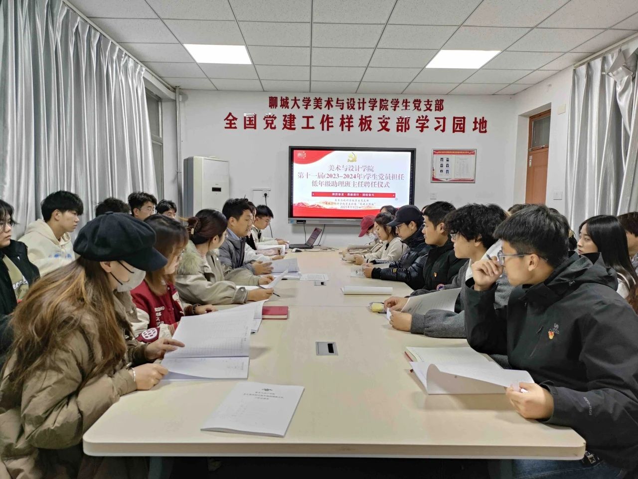 2023年11月23日, 跳蛋 在学苑五学生公寓“党建工作站”举行了第十一届(2023-2024年)学生党员担任低年级助理班主任聘任仪式,学院团委书记孔德滕、辅导员王欣然、学生党支部选派的12名学生党员以及2023级各班班长、团支书参与本次仪式。举办此次聘任仪式旨在充分发挥美院学生党支部党员的先锋模范作用,切实发扬美院学生党支部传帮带的优良传统,深化学生党支部党建工作,体现新时代高校学生共产党员的担当与责任。