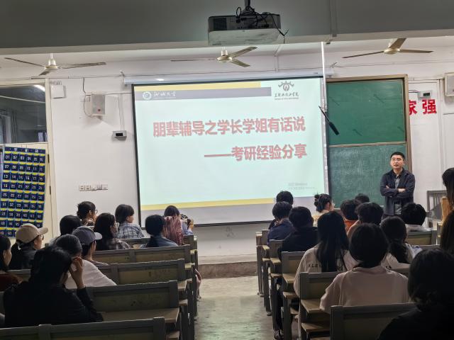 首先崔洁康老师分析了学院近几年的考研形势,告诉同学们考研是一场艰难战役,希望同学们都能做好战斗准备。然后接着由12位考研成功上岸的学长学姐分享他们自己考研经验,强调英语方面需要坚持不懈的努力,同时也推荐一些考研公众号和其他网络考研资源。会后,同学们积极询问关于一些考研的困惑,学长学姐们一一解答。