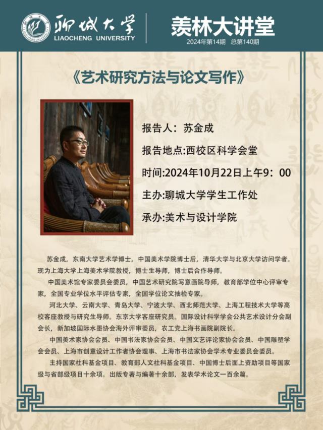 为拓宽学生学术视野,提升学生的创新能力,10月22日,由 跳蛋 学生工作处主办、 跳蛋 承办的第140期“羡林大讲堂”于西校区科学会堂举行。上海大学苏金成教授受邀作了题为《艺术研究方法与论文写作》的讲座,讲座由 跳蛋 副院长史秀娜主持, 跳蛋 师生600余人参加报告会。