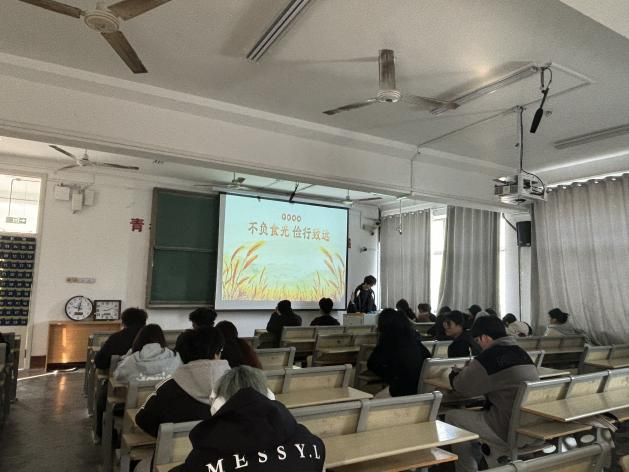 在宣讲活动开始前,负责人积极进行宣传,向同学们详细说明和阐释活动的目的。当活动正式开始时,负责人通过播放短片来使同学们更好的了解目前世界的粮食安全现状,激发同学们的思考并提高参与热情。宣讲内容主要围绕世界与中国的粮食现状,目前粮食安全威胁以及影响粮食安全的因素来展开深入讨论。在宣讲过程中,负责人还讲述了应对粮食危机应当如何做,倡导同学们节约粮食,以实际行动来保护粮食安全。最终活动在热烈的氛围中圆满结束。