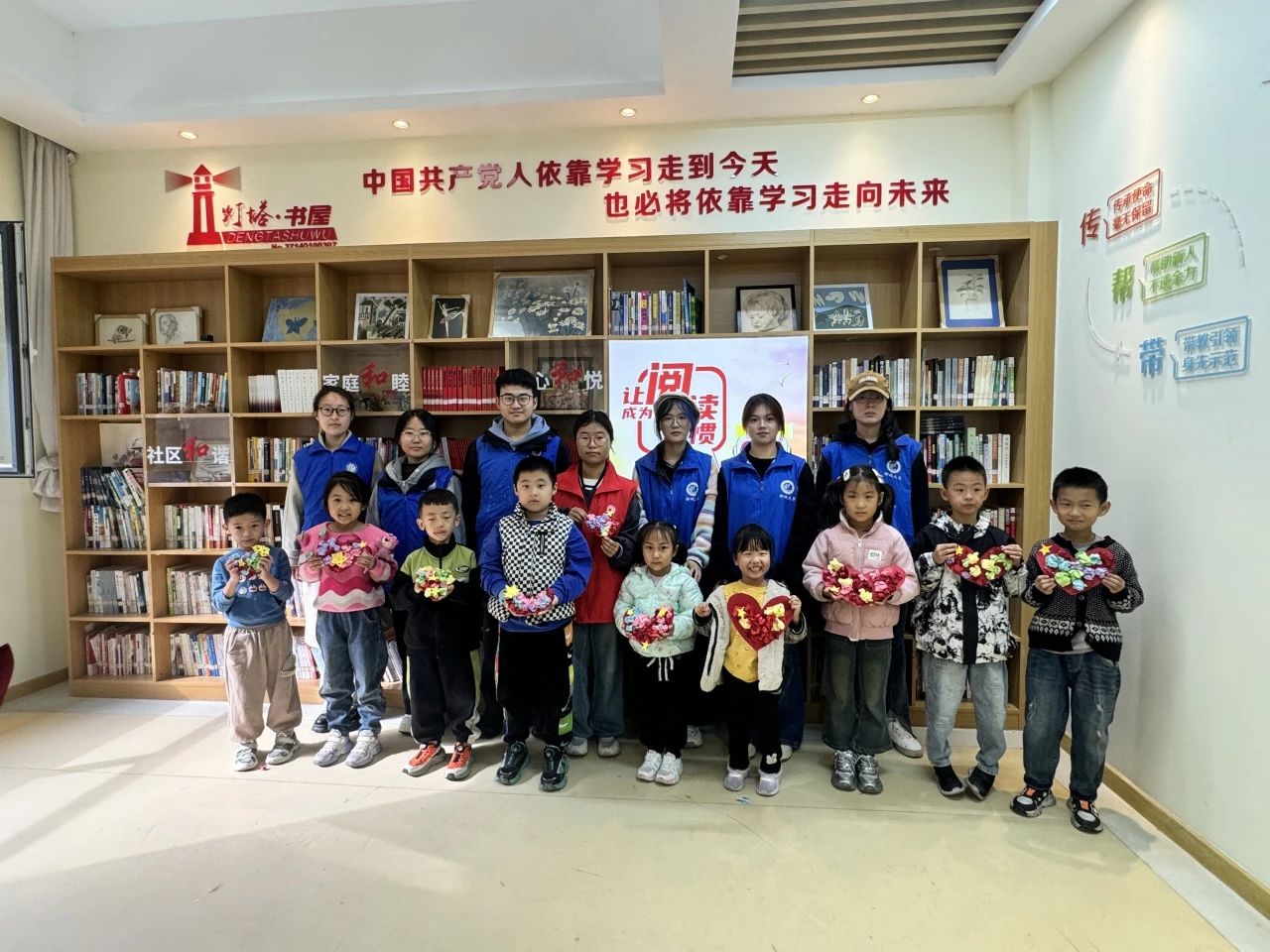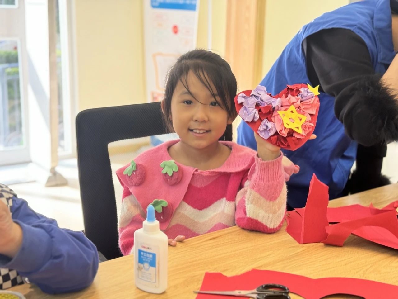活动开始,志愿者们为孩子们分发卡纸、剪刀等材料,并由一名志愿者为孩子们讲解活动主题以及制作步骤,同时让孩子们进一步了解沂蒙精神。志愿者们引导小艺术家们将卡纸剪成爱心的形状,并在志愿者帮助下把爱心卡纸涂满胶水,孩子们用一双双小手将彩纸揉成团状当作爱心上的花朵,再将彩色纸团依依粘到爱心红旗上,最后孩子们小心翼翼的剪下金黄色的五角星,给红旗添上最后一笔色彩。简单的手工让孩子们意犹未尽,争先恐后的展示自己的作品。一面面爱心红旗融艺术性、美观性于一体,饱含红色精神。活动的最后志愿者们与孩子们拿着制作的爱心红旗合影留念,为今天的活动画下一个圆满的句号。
