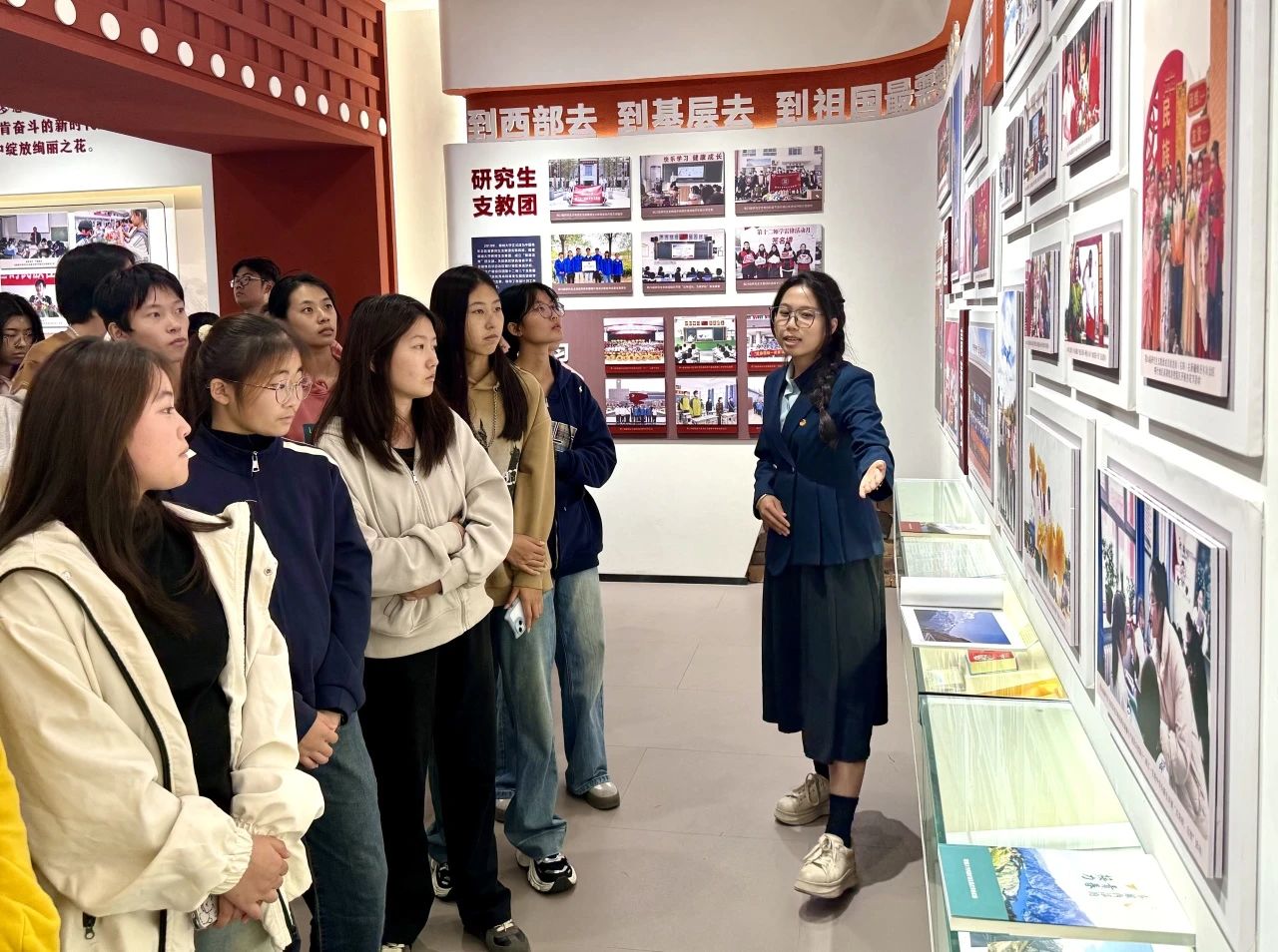 在西部计划展览馆中,讲解员围绕西部计划五个单元展区生动讲述跳蛋 学子响应号召、投身西部的奋斗故事,将扎根西部、无私奉献的精神传递给同学们,展现出历代聊大人崇高的志愿服务精神与不怕吃苦、敢于担当的青春主旋律,激励同学们担当时代使命、投身祖国建设。