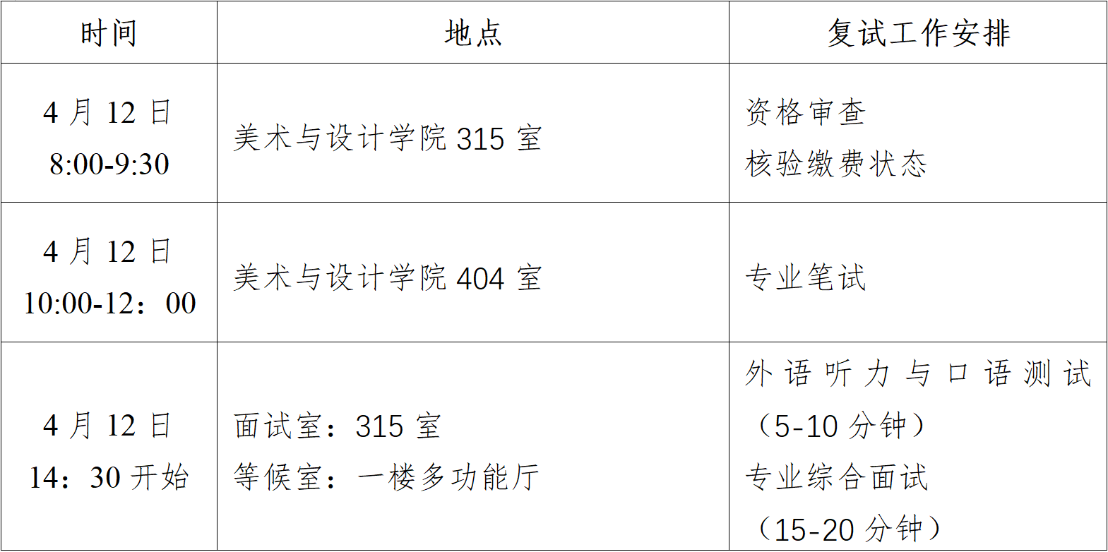 现场调剂:调剂复试于4月12日进行。请考生携带相关材料于4月12日8:00前到 跳蛋 西校区7号楼315室进行复试资格审核。专业笔试于12日10:00在404室进行。专业综合面试于12日14:30在7号教学楼315室进行。请考生凭准考证自西校区北门入校。具体时间安排如下: