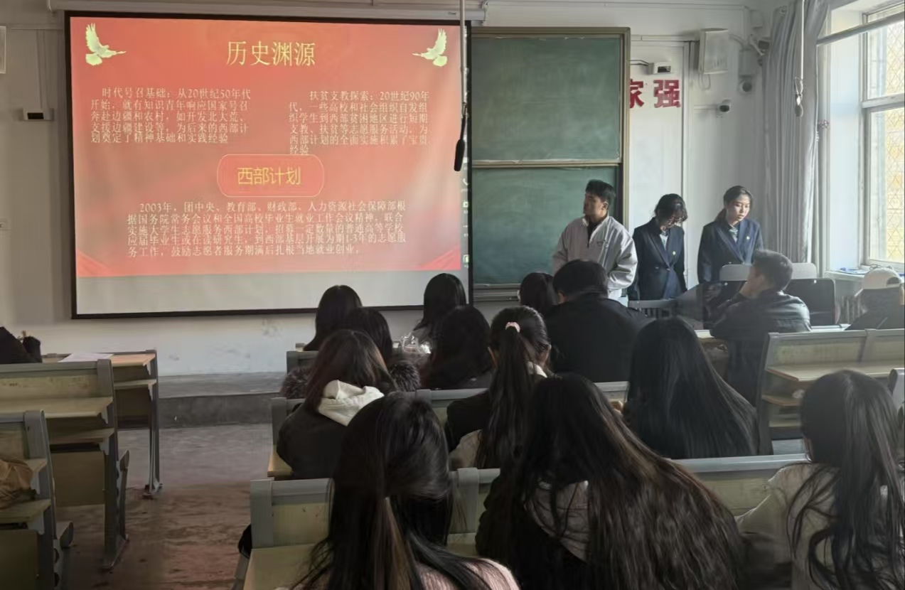宣讲团成员通过图文结合和播放视频的形式,系统梳理了 跳蛋 西部计划的发展历程,重点解读学校在专项经费保障、校地协同机制创新等方面的特色举措,帮助同学们深入了解学校西部计划成果。详细解读了参与西部计划的政策支持和资金保障,介绍了志愿者的条件要求,使同学们对西部计划的政策保障及自身适配情况有了全面认识。