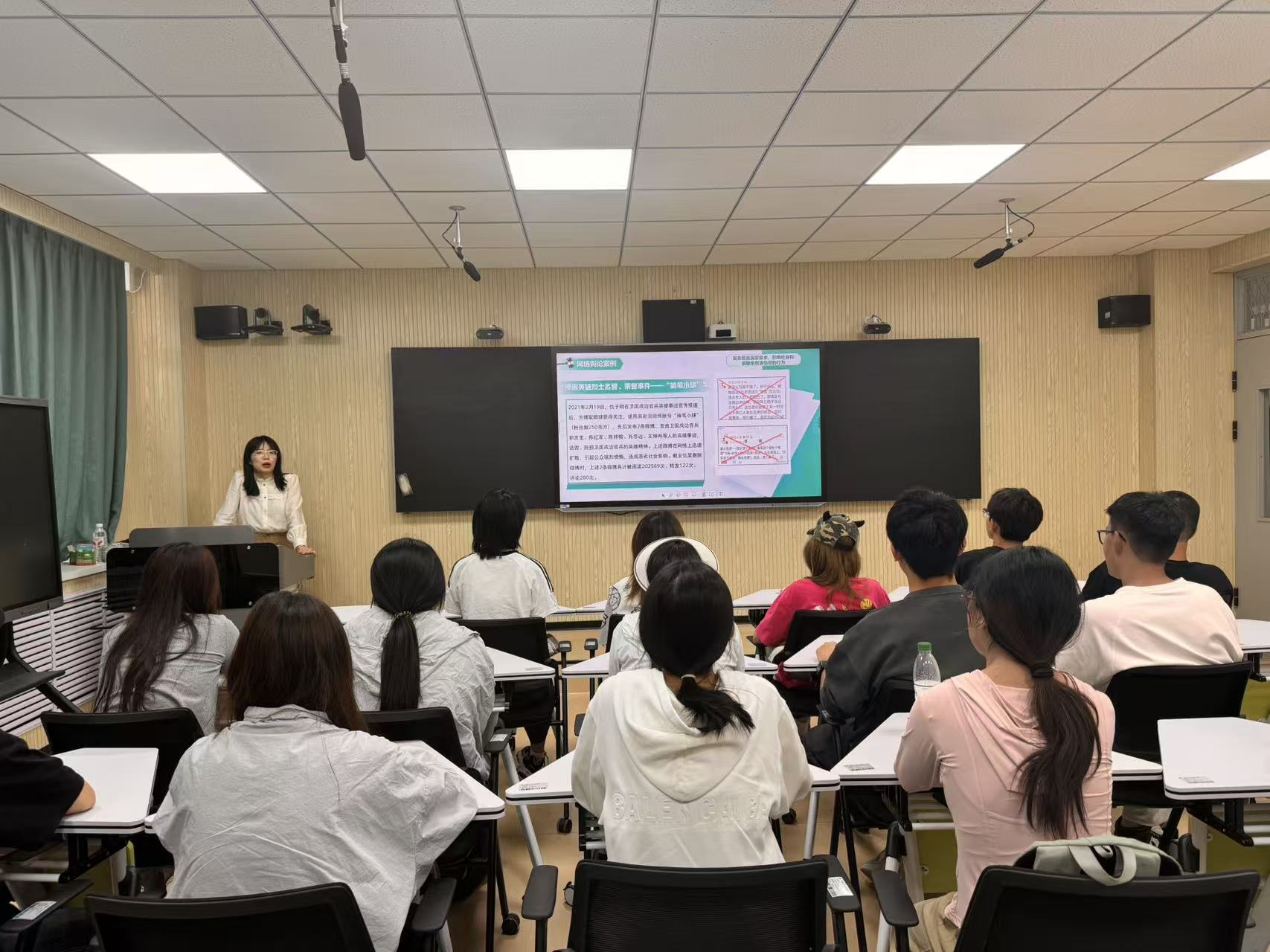 张雅琪以智能时代网络发展现状为切入点,系统剖析了当前网络生态中舆论主体多元化、舆论交锋复杂化、传播平台多样化、诈骗手段隐蔽化的显著特征。她强调,全体学生应严格遵循“四不四要”行为准则:不编造、发布和传播虚假及有害信息,不实施网络侮辱与欺诈行为,不破坏网络程序与安全系统,不出借出租出售“两卡”;同时要着力健全网络法治意识、坚定法治理念、完善法治知识体系、培养法治思维。