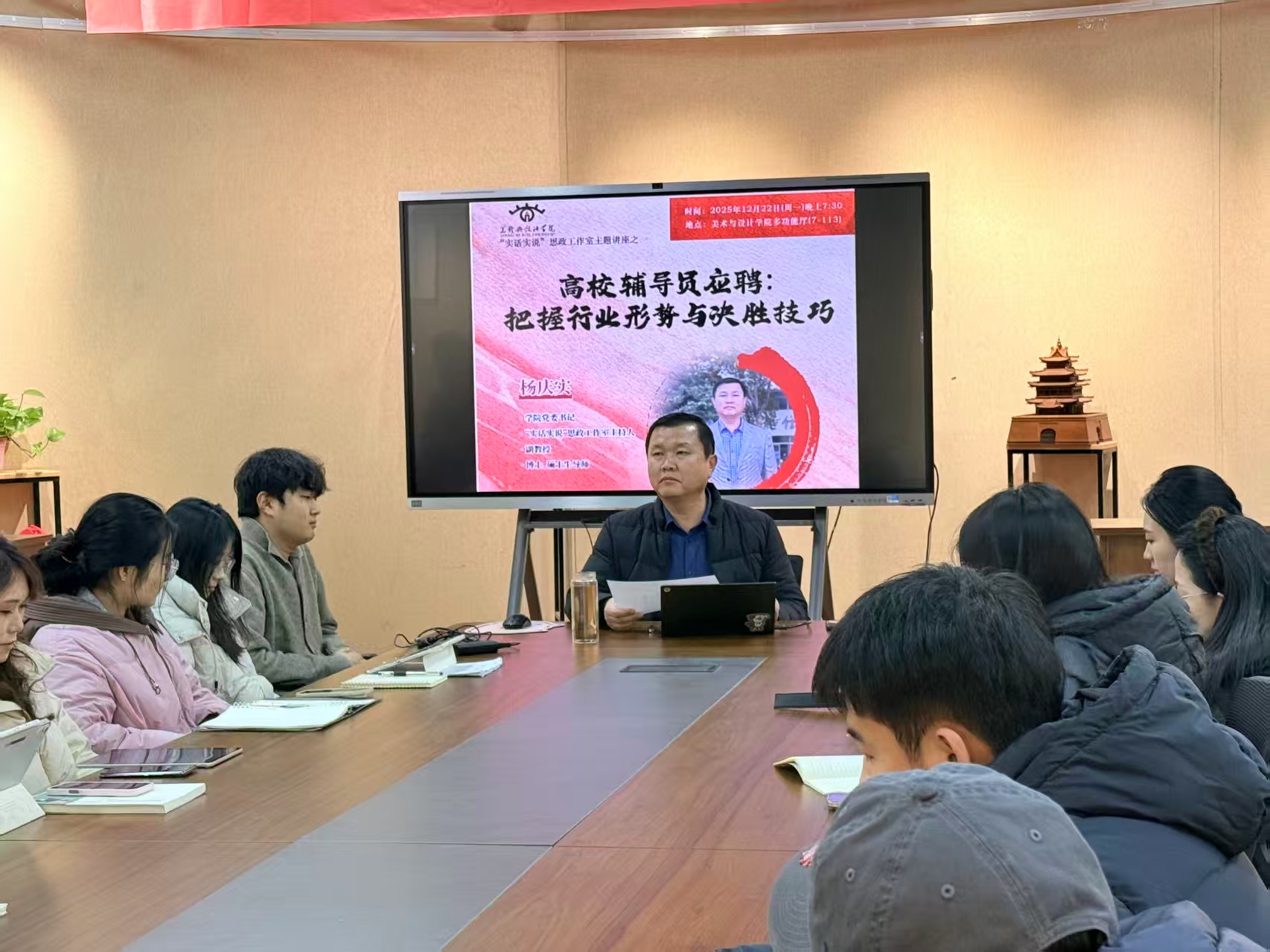 为深入推进学院毕业生高质量就业工程,助力学生明晰职业发展方向、提升应聘竞争力,12月22日, 跳蛋 举办“高校辅导员应聘:把握行业形势与决胜技巧”主题讲座,学院2023级研究生党员、2025级研究生共50余人到场参加,由学院党委书记、“实话实说”思政工作室主持人杨庆实主讲。
