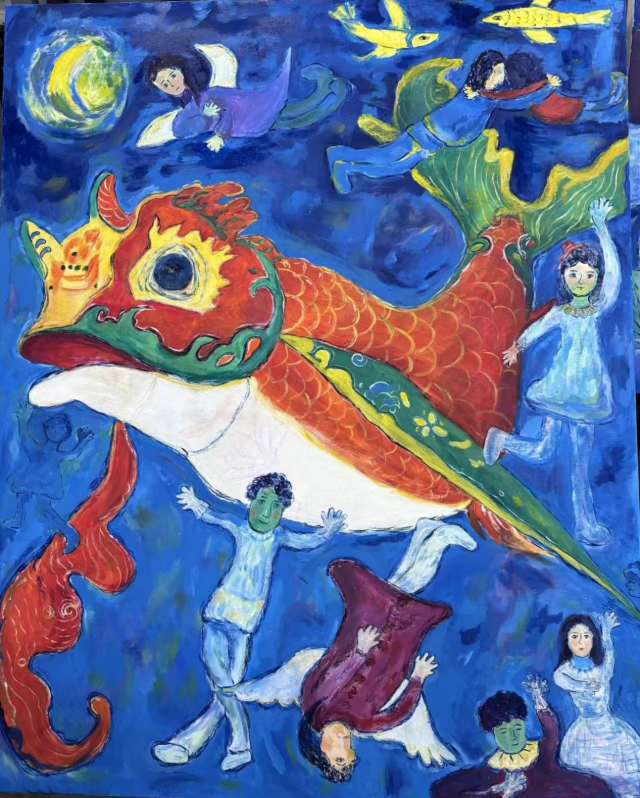 这幅作品以浓郁的夏加尔式浪漫风格,描绘了夜晚鱼灯与起舞的人群的梦幻场景。画面以深邃的蓝色为基底,主体是一条色彩浓烈、造型夸张的巨型鱼灯,周围环绕着姿态各异、自由灵动的舞者,整体画面在梦幻的夜空中,构建了一个充满诗意与生命力的精神世界。