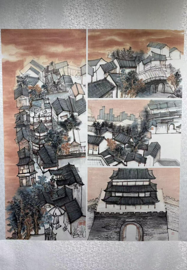 《小城记忆》是以聊城古城为主题的山水作品,以传统水墨技法为基础,结合淡彩设色,将聊城古城的传统民居、城楼建筑与现代城市景观进行视觉并置。通过古今场景的对话,串联起小城的时代印记。