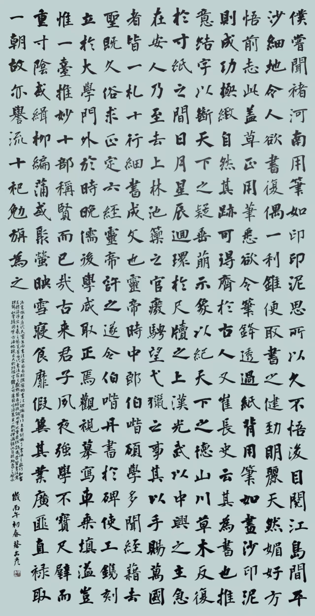 此幅楷书作品以唐代《法书论》为内容,通篇布局规整、气脉贯通,尽显端庄雍容的庙堂之气。笔法上融唐楷的雄健与唐墓志的朴厚,中锋行笔沉稳扎实,提按顿挫分明,起收严谨而不失灵动,线条刚劲饱满、力透纸背,兼具骨力与温润。结体宽博方正、疏密得宜,欹正相生间稳如泰山。