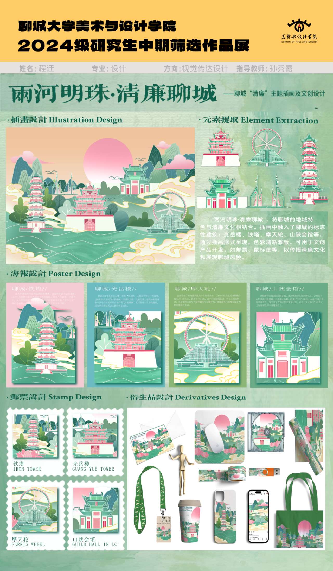 “两河明珠·清廉聊城”主题插画及文创设计,以聊城黄河与大运河交汇的地域特色为根基,将光岳楼、铁塔、摩天轮、山陕会馆等城市标志性建筑,与“清廉文化”内涵深度融合。设计旨在以轻量、亲和的方式传播聊城地域文化与廉洁理念,让“清廉水城”的城市形象与文化精神,通过生活化的文创产品触达大众,完成传统文化与廉洁文化的创造性转化与年轻化表达。