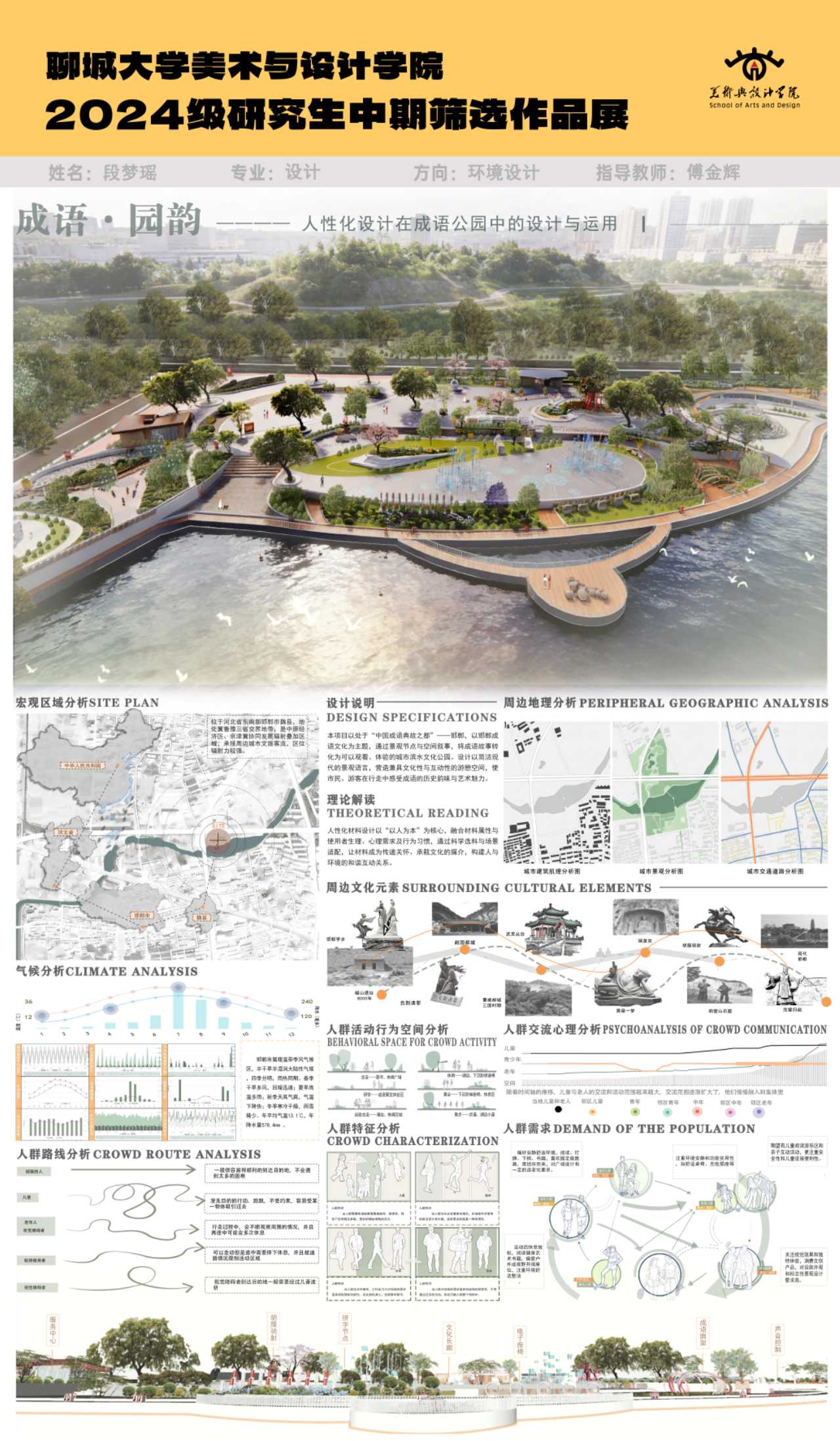 本项目以处于"中国成语典故之都"邯郸,以邯郸成语文化为主题,通过景观节点与空间叙事,将成语故事转化为可以观看,体验的城市滨水文化公园。设计以简洁现代的景观语言,营造兼具文化性与互动性的游憩空间,使市民,游客在行走中感受成语的历史韵味与艺术魅力。