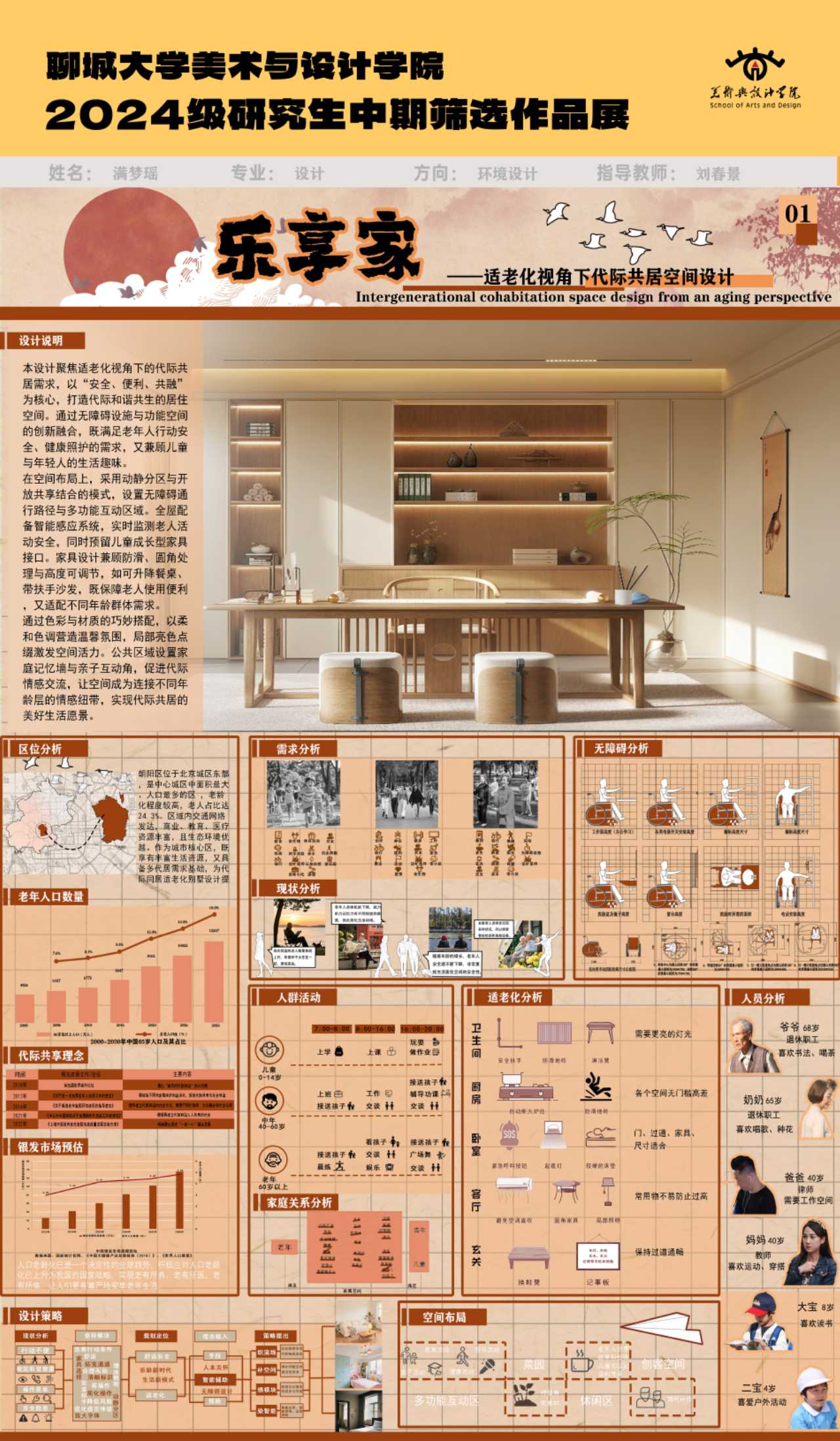 本设计聚焦视老化视角下的代际共居需求,以“安全、便利、共融”为核心,打造代际和谐共生的居住空间,通过无障碍设施与功能空间的创新融合,既满足老年人行动安全健康照护的需求,又兼顾儿童与年轻人的生活趣味。让空间成为连接不同年龄层的情感纽带,实现代际共居的美好愿景。