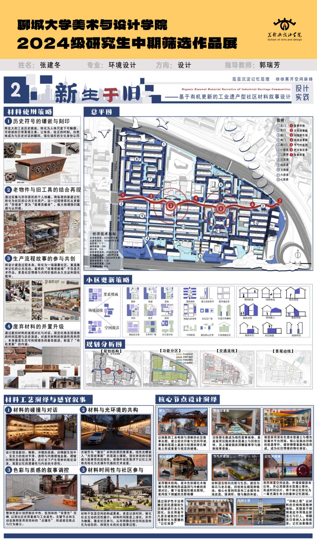 本方案以“新生于旧”为核心理念,对太原矿机小区进行工业遗产有机更新。通过历史符号镶嵌、老物件再利用、生产流程共创及废弃材料升级,将工业遗存转化为叙事载体。在空间更新中,以材料工艺演绎与核心节点设计,唤醒社区记忆,重构邻里情感,实现工业遗产与现代生活的共生共融。