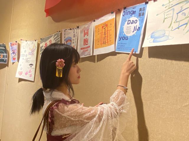 活动过程中,志愿者们将事先收集好的作品贴在展板上,同学们有序进行欣赏,志愿者们向同学们讲解作品的涵义。一幅幅的海报、书法作品,承载的不仅仅是同学们个人对青岛市人民的担心,更是整个 跳蛋 对青岛市疫情的应援。当一幅幅作品被贴到展板上时,展现给我们的不是毫无生命的作品,而是一份份坚定的心。这份温暖与力量吸引了大量的同学们驻足观看,他们站在作品前或者独自思考,或者与身边的朋友低声交流;参加此次活动的同学也都在互相讨论着对方的作品,用心去体会作者要表达的情感,同时也在分享着各自的疫情防控知识和措施。同学们互相交流的声音,更给此次活动增添了色彩,使这次活动达到了很好的效果,同学们都感受到了团结的力量,明白了加强体育锻炼,培养良好的卫生习惯的重要性。