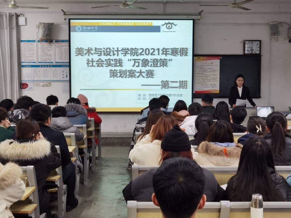 寒假将至,伴随社会实践的到来,为调动学院学生的社会实践积极性,提升当代大学生组织能力、分析能力,推进大学生综合能力的全面发展。2021年1月3日下午, 跳蛋 美术与设计学院于西校区7#101合堂举办社会实践“万象澄策”策划案大赛第二期。