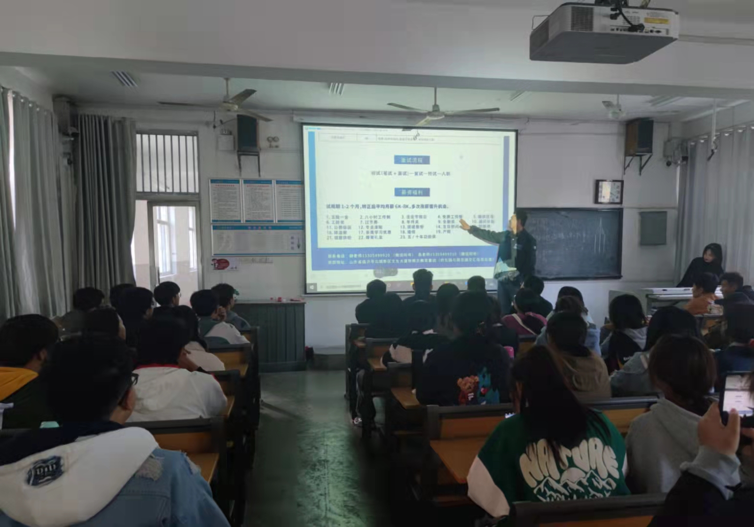 首先,临沂新概念教育集团总经理助理展示了招聘会PPT,让同学们有了大概的了解,接着该集团总经理通过自身经验、视频等向同学们分析了当前大学生就业的相关形式和所需要注意的事情,并详细的介绍该集团概况、优势等。紧接着,总经理通过“集团简介”、“招聘需求”、“面试流程”、“薪资福利”四个方面层层递进的讲述了该企业招聘简章,为同学们在未来的求职路上更加明确了方向,了解了更多就业知识。最后,本次招聘会圆满结束。