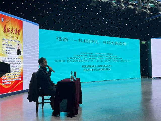 王青松结合自身“沂蒙少年到文艺工作者”的成长轨迹与实践经验,以“专业深耕、事业开拓、社会责任、职业领航”四维视角,向同学们诠释“扎根时代 书写人生”的真谛。专业上,他秉持“守正出新,固本清源”,经系统深造后屡入全国书法篆刻展等国家级赛事,凭《毛泽东诗词书法长卷》斩获泰山文艺奖、获国家艺术基金资助,以笔墨传承创新。事业上,他以弘扬传统文化为初心,搭建莒县书法院与青松书画学校,践行“三贴近”理念,培养学员5000余人次,输送20名书法专业大学生,培育数十名省市书协会员,获“文化惠民单位”等荣誉。社会责任方面,他以政协委员等身份,开展经济捐助、文化扶贫、赴疆支教等百余场公益活动,践行“艺术服务人民”。针对职业发展,他给同学们四大建议:找准“热爱+专业+社会需求”之“根”,遵循“积累-实践-创新”路径,理性看待就业创业,追求“职业、志业、事业”统一,并鼓励同学们摒弃浮躁、扎实积累,在时代中实现价值。