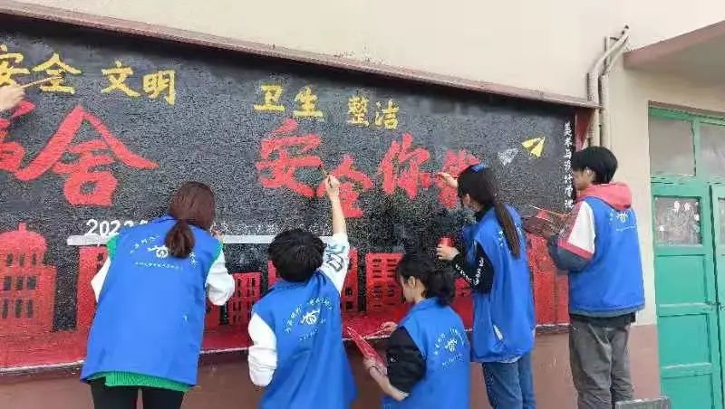 志愿者们提前将板报绘制过程中所需的粉笔、喷漆、颜料、笔刷等工具材料准备齐全,认真商讨分析本次黑板报绘制中所要用的素材与排版,并且分配好了各自的任务。几位志愿者轻轻挥动画笔,图文便渐渐在黑板上浮现,他们分工明确,充分发挥自己的专业技能特长,有条不紊地进行着绘制。经过几个小时的努力,不知不觉中,黑板便已被填满,板报的绘制顺利完成,潇洒遒劲的行楷字体、富有感染力的颜色搭配和简明的排版设计,都凝聚着志愿者的汗水和智慧。