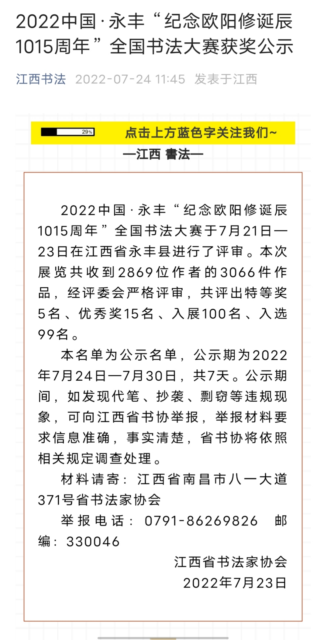 7月24日,江西省书法家协会公布了2022中国·永丰“纪念欧阳修诞辰1015周年”全国书法大赛获奖名单, 跳蛋 2019级本科生何传宇获特等奖,奖金10000元。