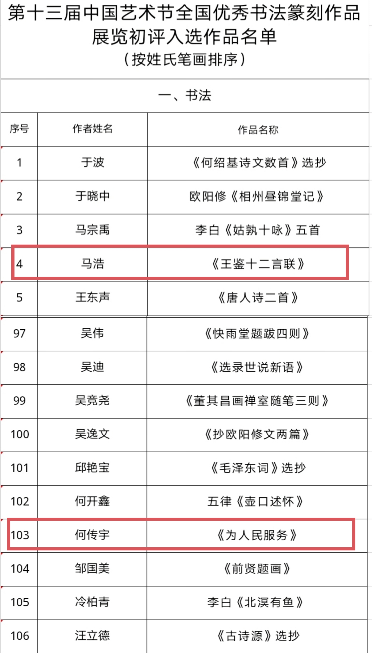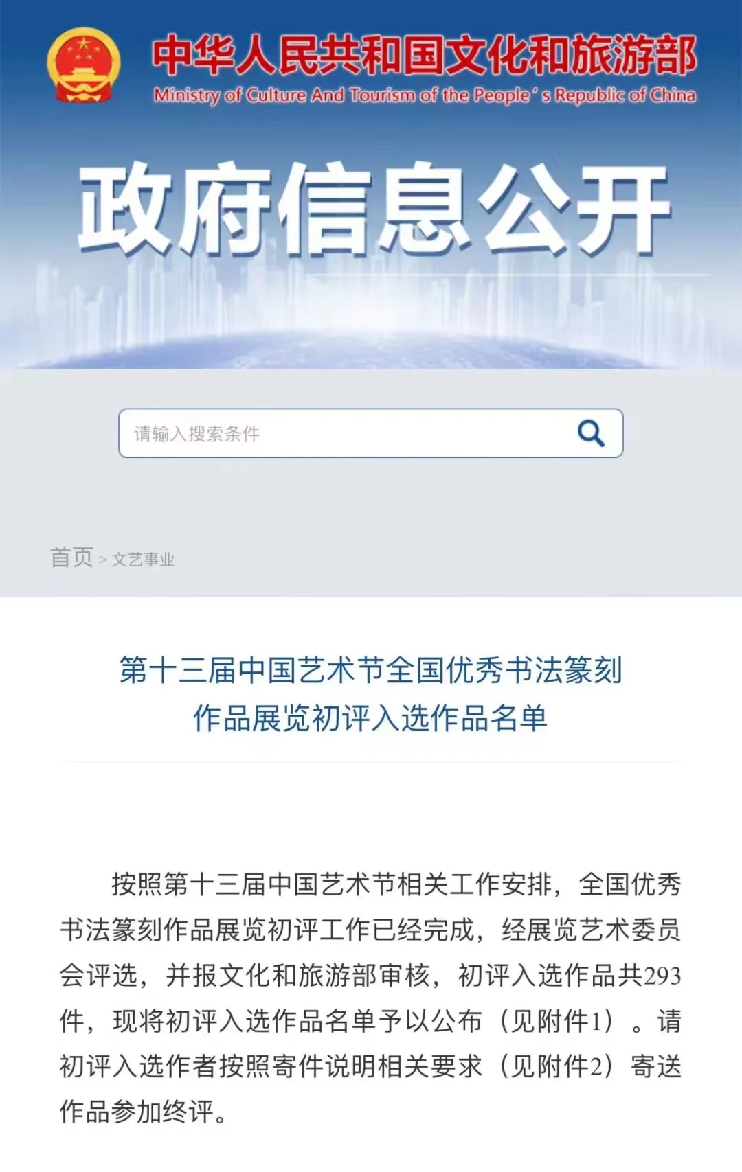 喜报: 跳蛋 2件书法作品在第十三届中国艺术节全国优秀书法篆刻作品展览初评入选 作者:白依凡 来源: 跳蛋 发布时间:2022-07-26 阅读次数: 7月14日,中华人民共和国文化和旅游部公布了第十三届中国艺术节全国优秀书法篆刻作品展览初评入选作品名单, 跳蛋 2021级研究生马浩书法作品《王鉴十二言联》,2019级本科生何传宇书法作品《为人民服务》入选。 马浩入选作品 何传宇入选作品 (审核 孔德滕)