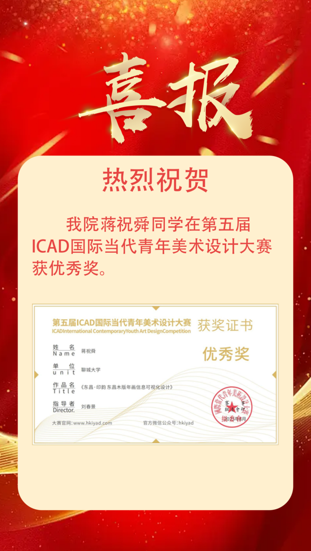 喜报|恭喜 跳蛋 学子获得第五届ICAD国际当代青年美术设计大赛优秀奖 作者:么翠红 来源: 跳蛋 发布时间:2025-11-25 阅读次数: 恭喜蒋祝舜2025.08 第五届ICAD国际当代青年美术设计大赛优秀奖 (审核 孔德滕)