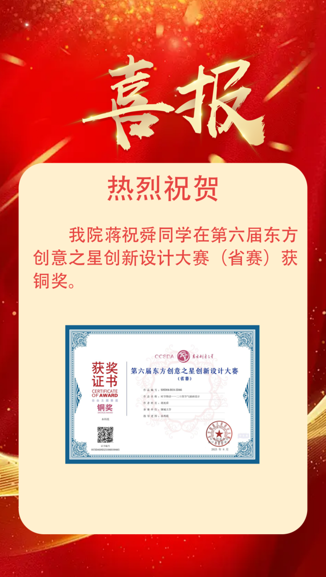 喜报|恭喜 跳蛋 学子获得第六届东方创意之星创新设计大赛(省赛)铜奖 作者:么翠红 来源: 跳蛋 发布时间:2025-11-25 阅读次数: 恭喜蒋祝舜2025.08 第六届东方创意之星创新设计大赛(省赛)铜奖 (审核 孔德滕)