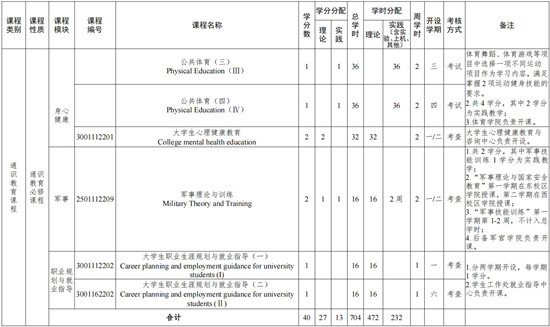 1.通识教育必修课程中包括理论课堂教学 472 学时,实践教学 232 学时,不含军事技能训练 2 周。