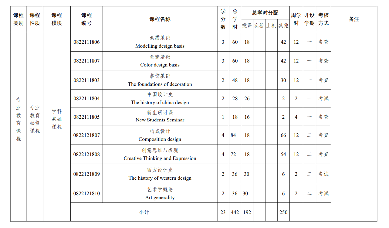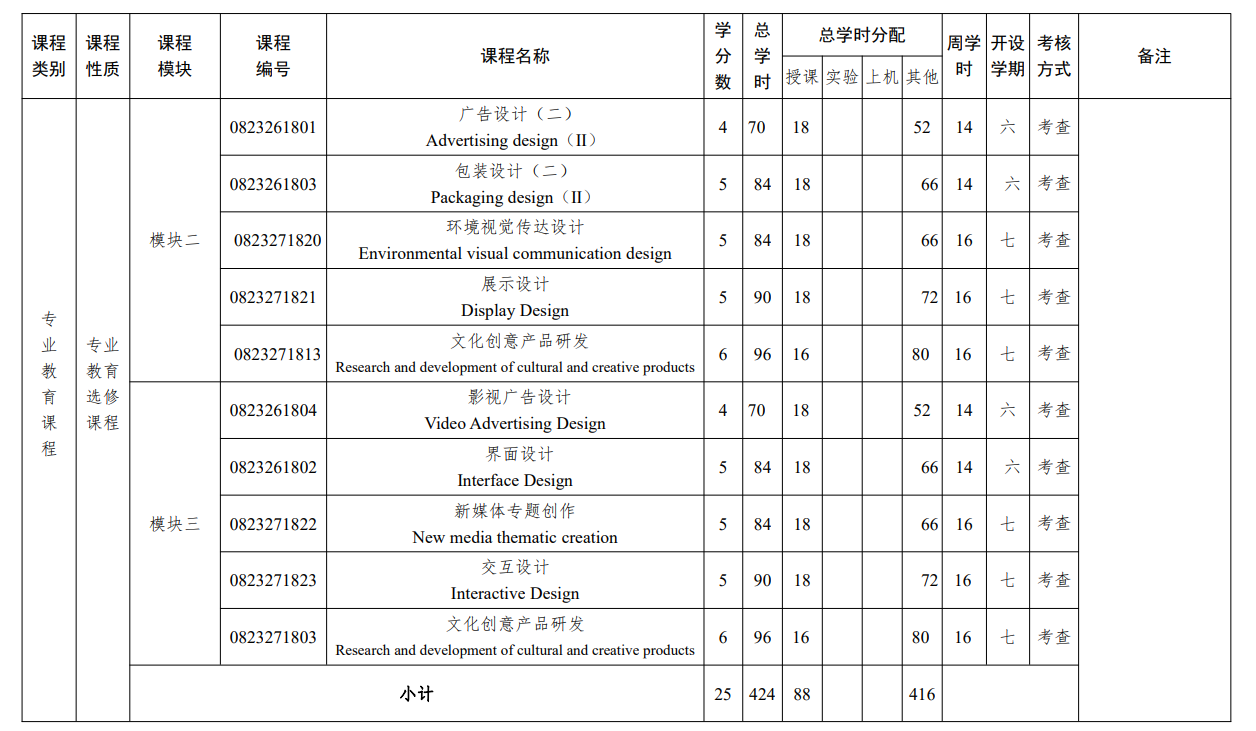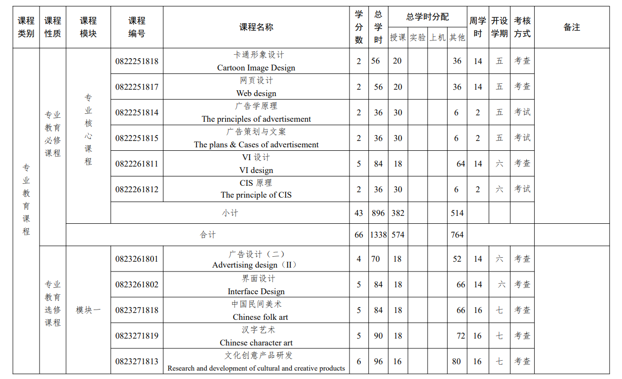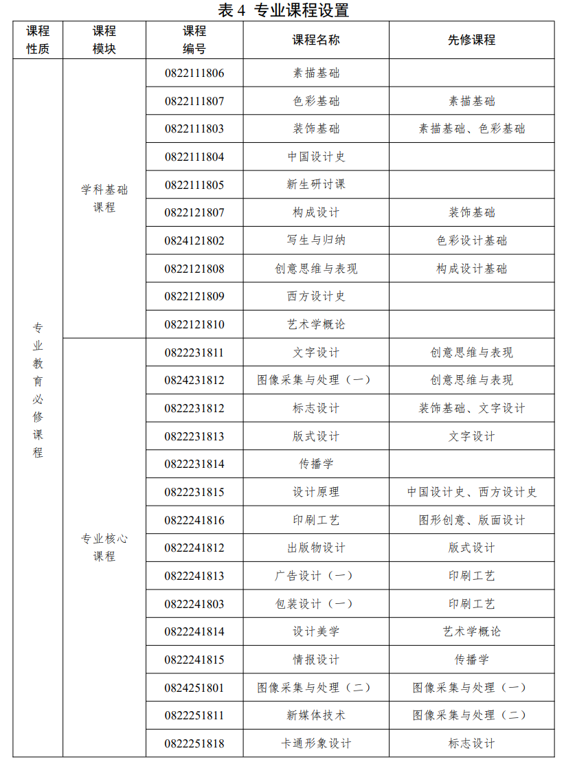 4 主干学科:设计学、艺术学。 主要课程:素描基础、色彩基础、装饰基础、构成设计基础、创意思维与表现、文字设计、图 像采集与处理(一、二)、标志设计、版面设计、印刷工艺、广告设计(一、二)、包装设计(一、 二)、新媒体技术、界面设计、VI 设计、影视广告设计、展示设计、中国设计史、西方设计史、艺 术学概论、传播学、设计原理、广告学原理、广告策划与文案、设计美学、情报设计、CIS 原理等。