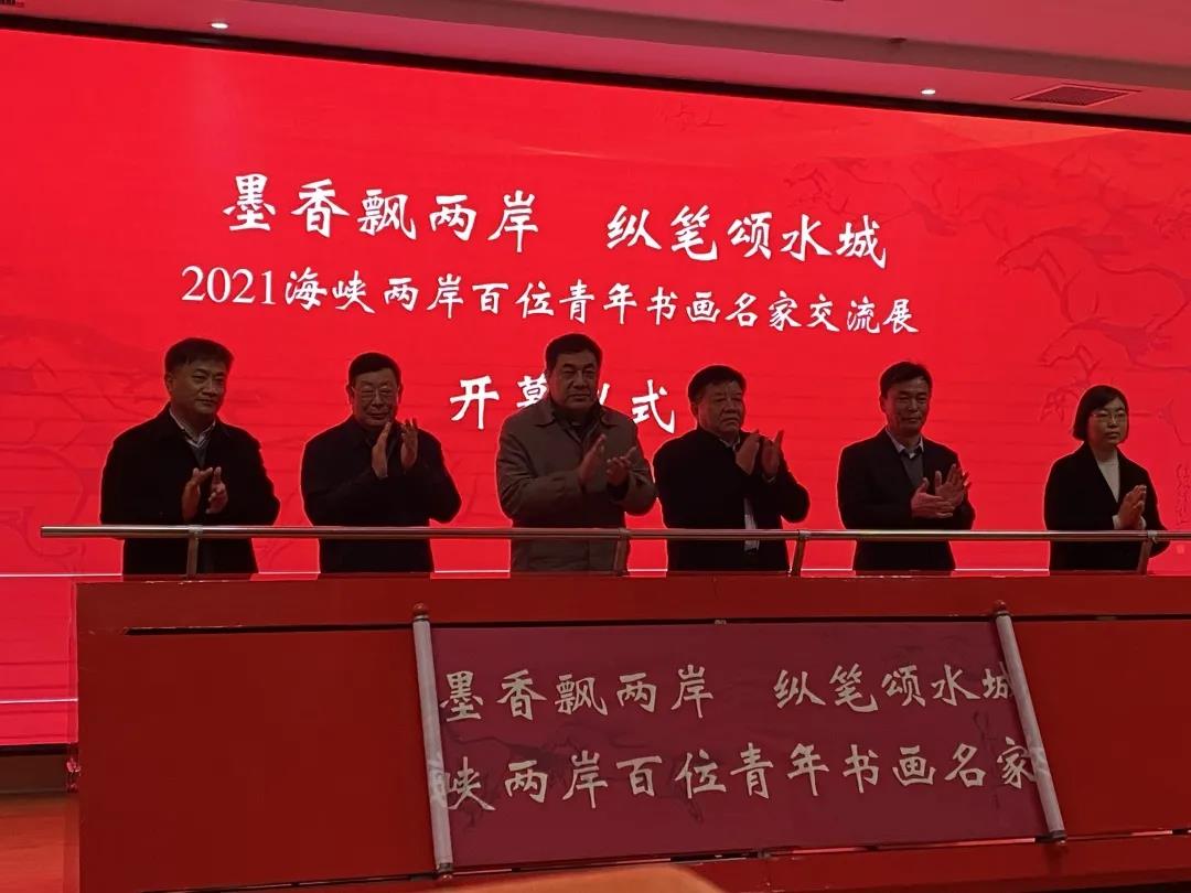 出席活动的领导和嘉宾共同启动了“墨香飘两岸,纵笔颂水城”聊台书画交流展,将开幕式推向高潮。