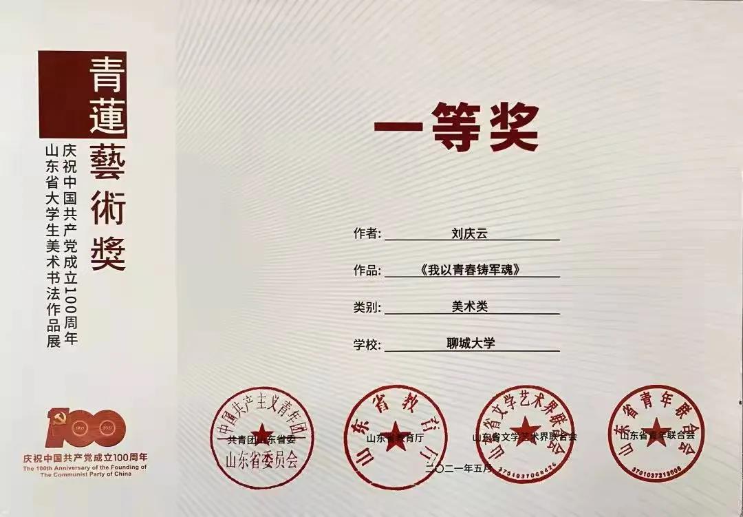 2021年5月《我以青春铸军魂》获山东省“青莲艺术奖”一等奖;